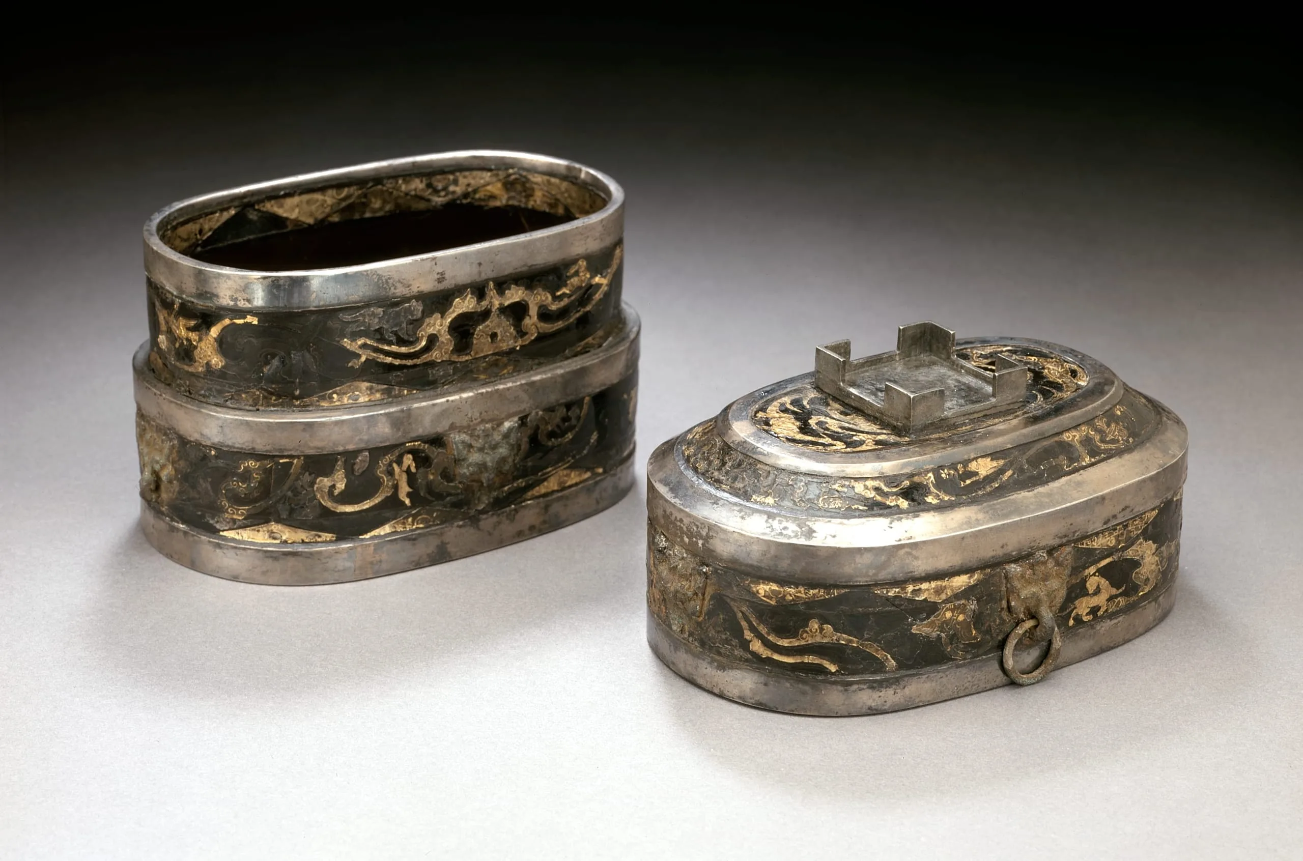 - Oval Lidded Cosmetic Box (Duoyuan He) with Scrolling Clouds, Animals, and Birds
