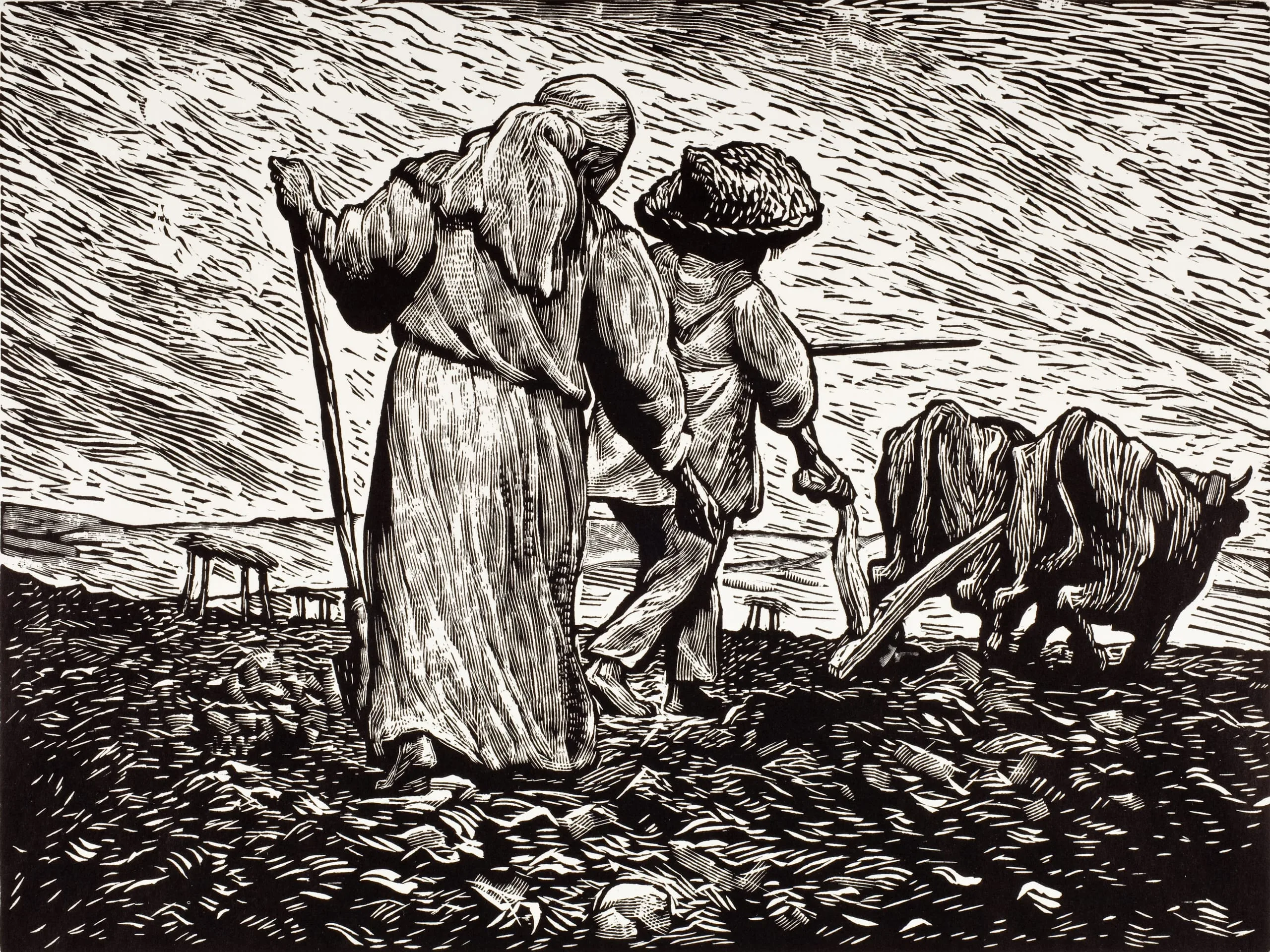 Leopoldo Méndez created this linocut for the opening credits of the film Pueblerina, directed by Emilio Fernández (1904–1986) and shot by Gabriel Figueroa (1907–1997)—two greats of the Golden Age of Mexican cinema. Film collaborations offered a new creative avenue to Méndez, who had long aspired to make graphic murals and to create prints on a large scale. In this image, the artist represents the film’s protagonists at work sowing a field. Employing a low-angle perspective, Méndez endows the work with a monumental quality that would be further enhanced by its projection on the movie screen.