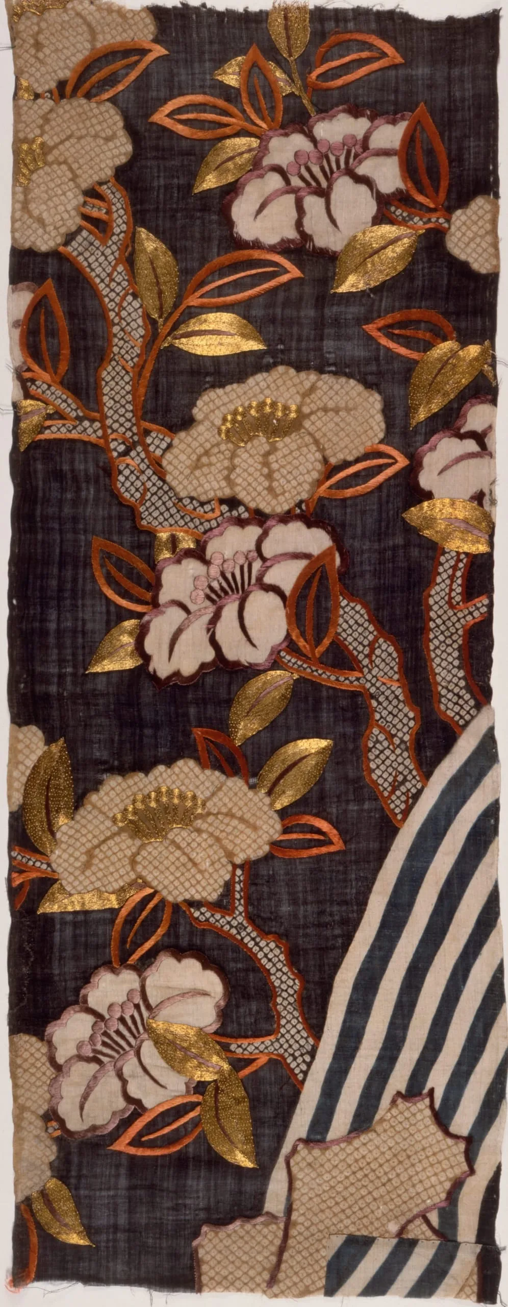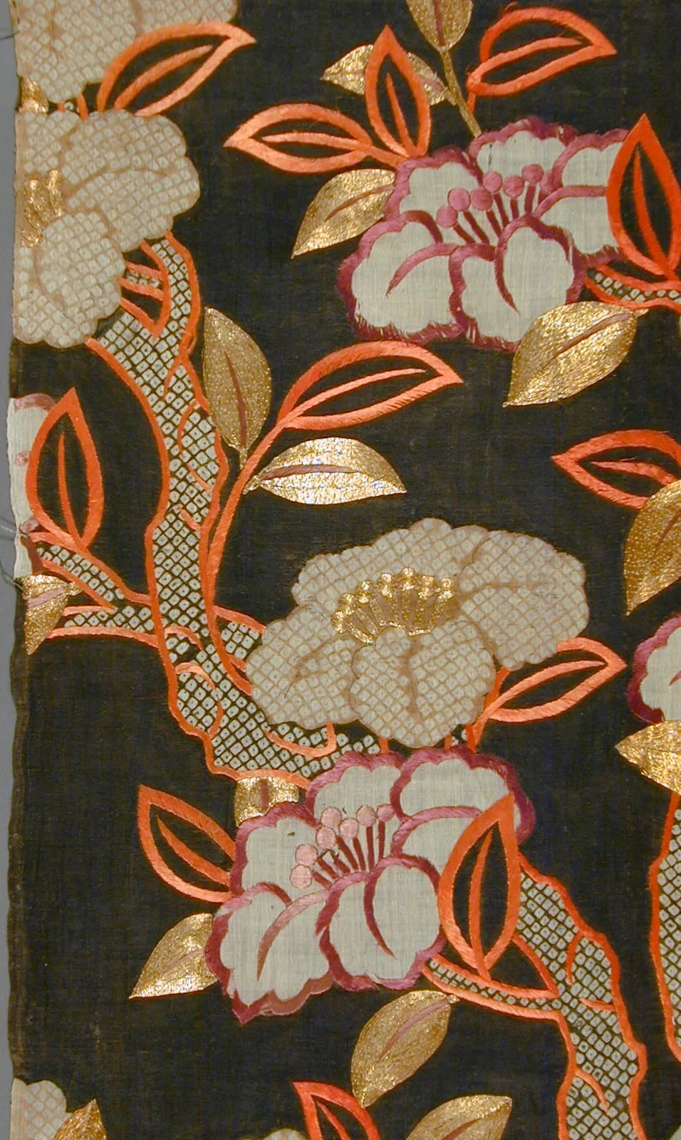 - Ramie (choma) plain weave, paste-resist dyed (noribōsen) and tie-dyed (kanoko shibori), with silk- and gilt-paper-wrapped-silk-thread embroidery