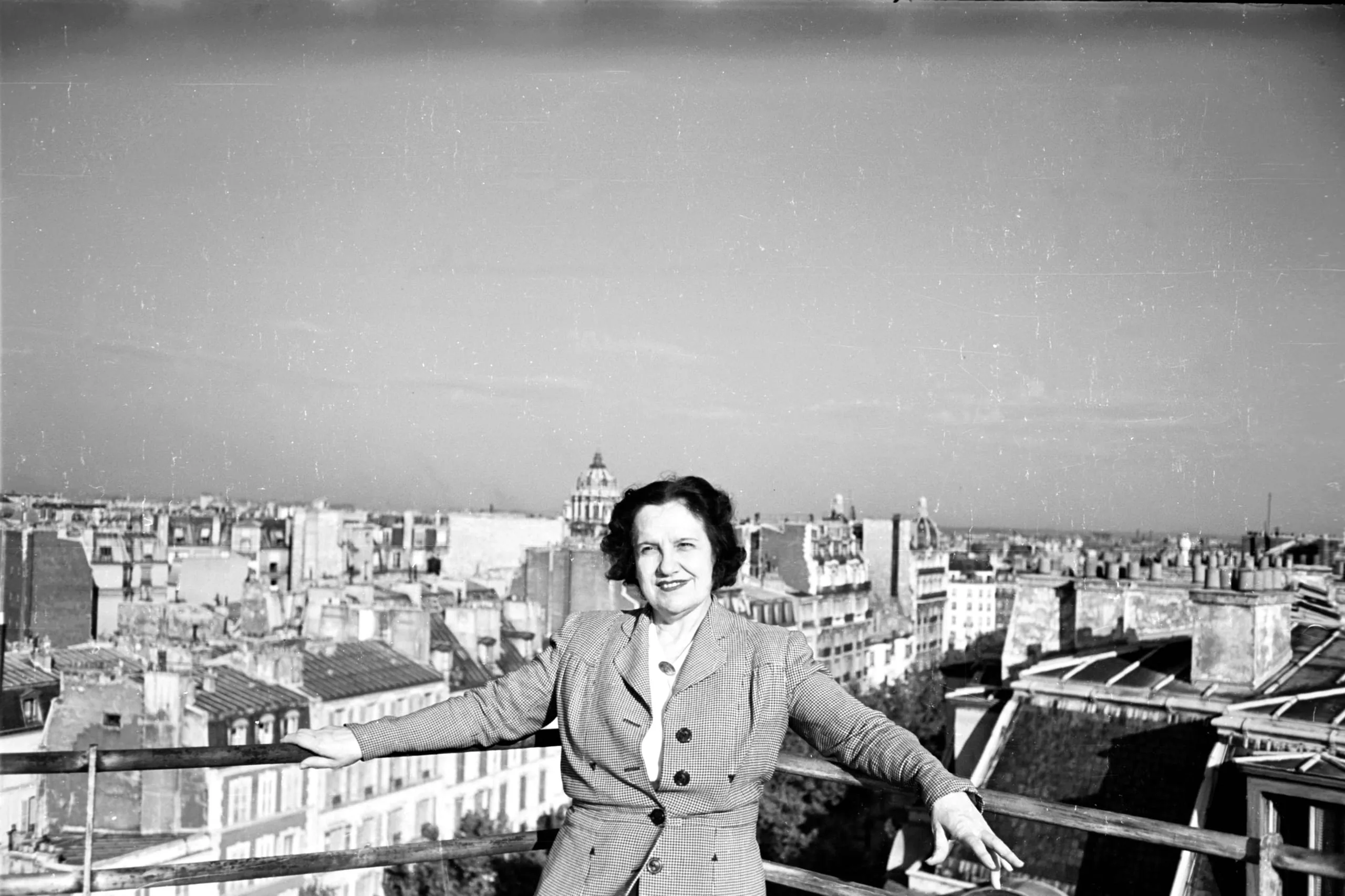 Black and white photograph, white woman in a checked blazer stands arms spread on a rooftop railing, dense European cityscape behind her