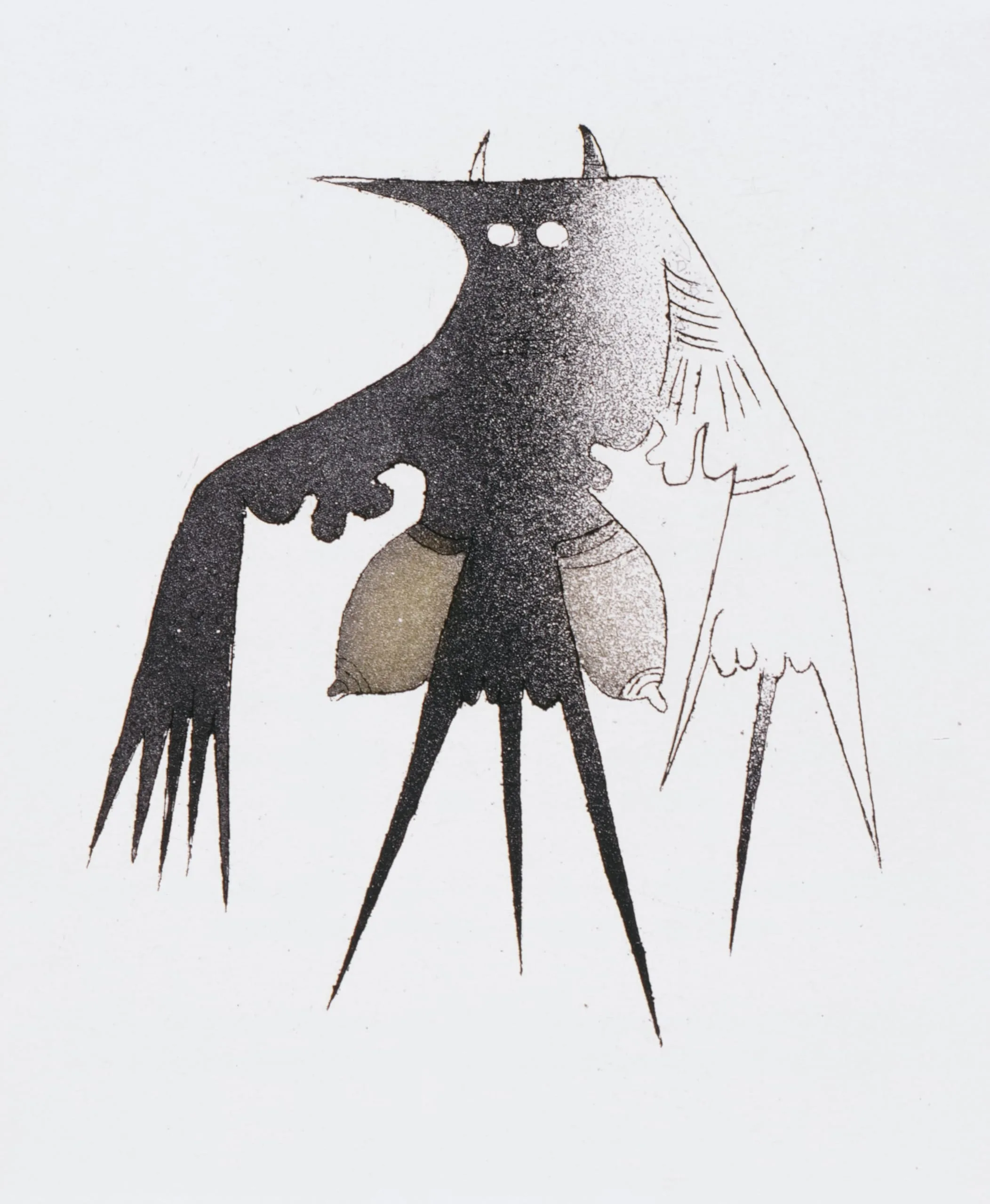 Print of a fantastical hybrid creature with horns, bat wings, and claw-like legs, rendered half in dense black stippling and half in outline only