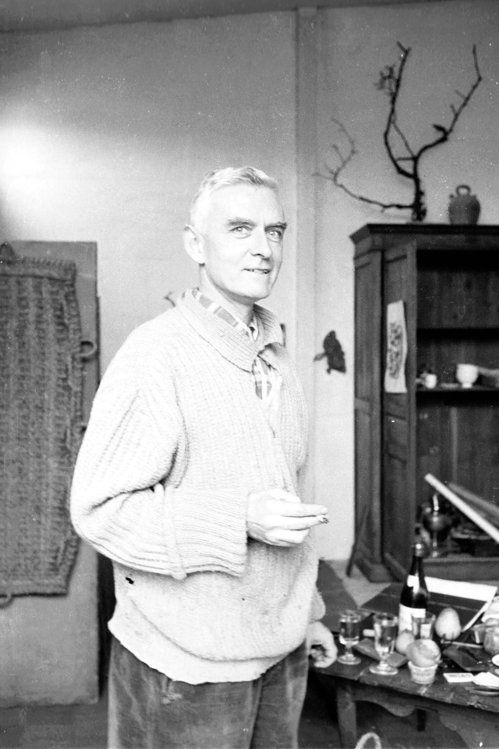 Black and white photograph of a white man from the hips up, standing in a studio interior, wearing a ribbed knit sweater and holding a cigarette