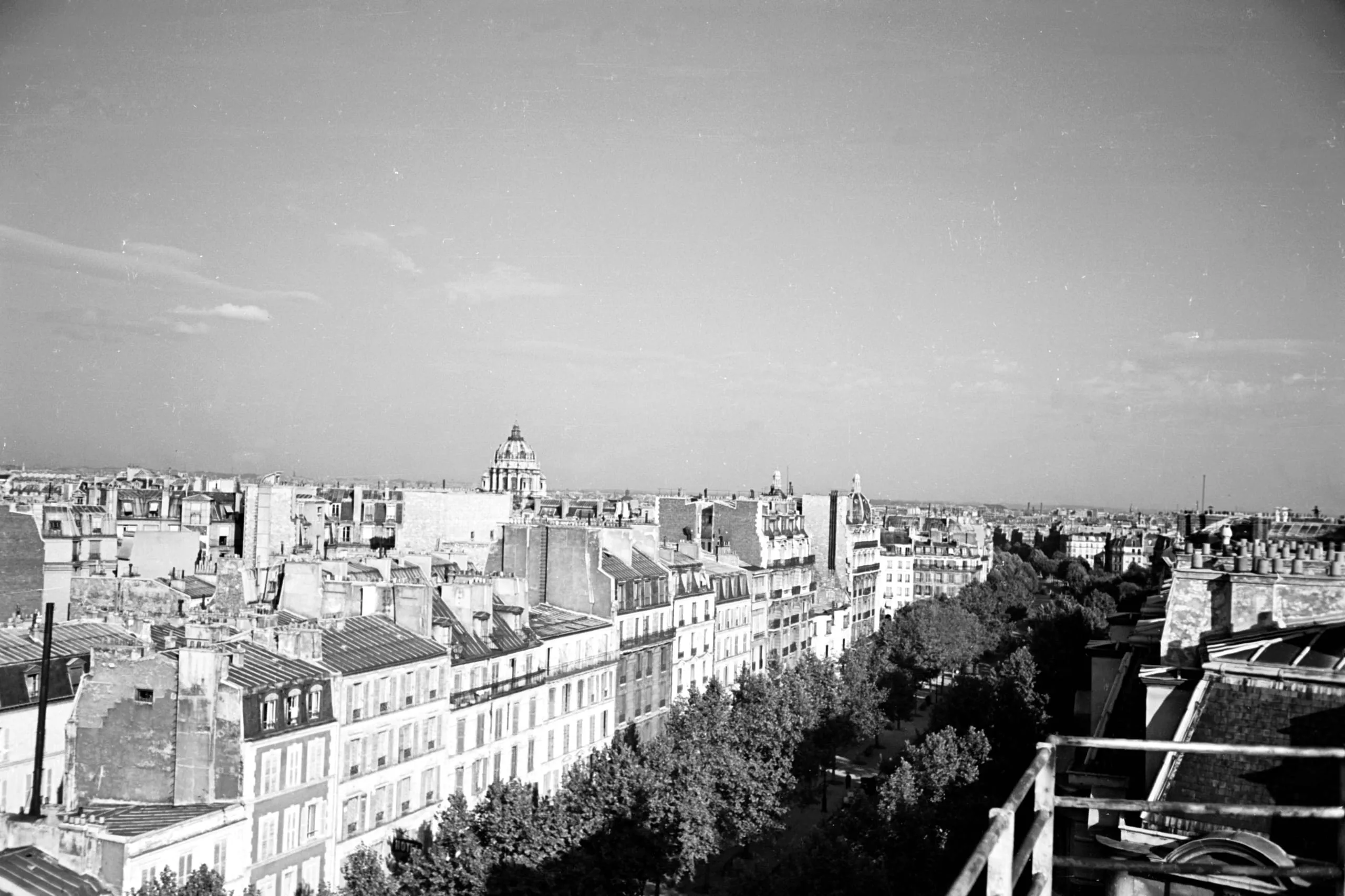 Black and white photograph, elevated cityscape view over rows of Haussmann-style buildings and tree-lined boulevard, with a large dome rising above the rooftops