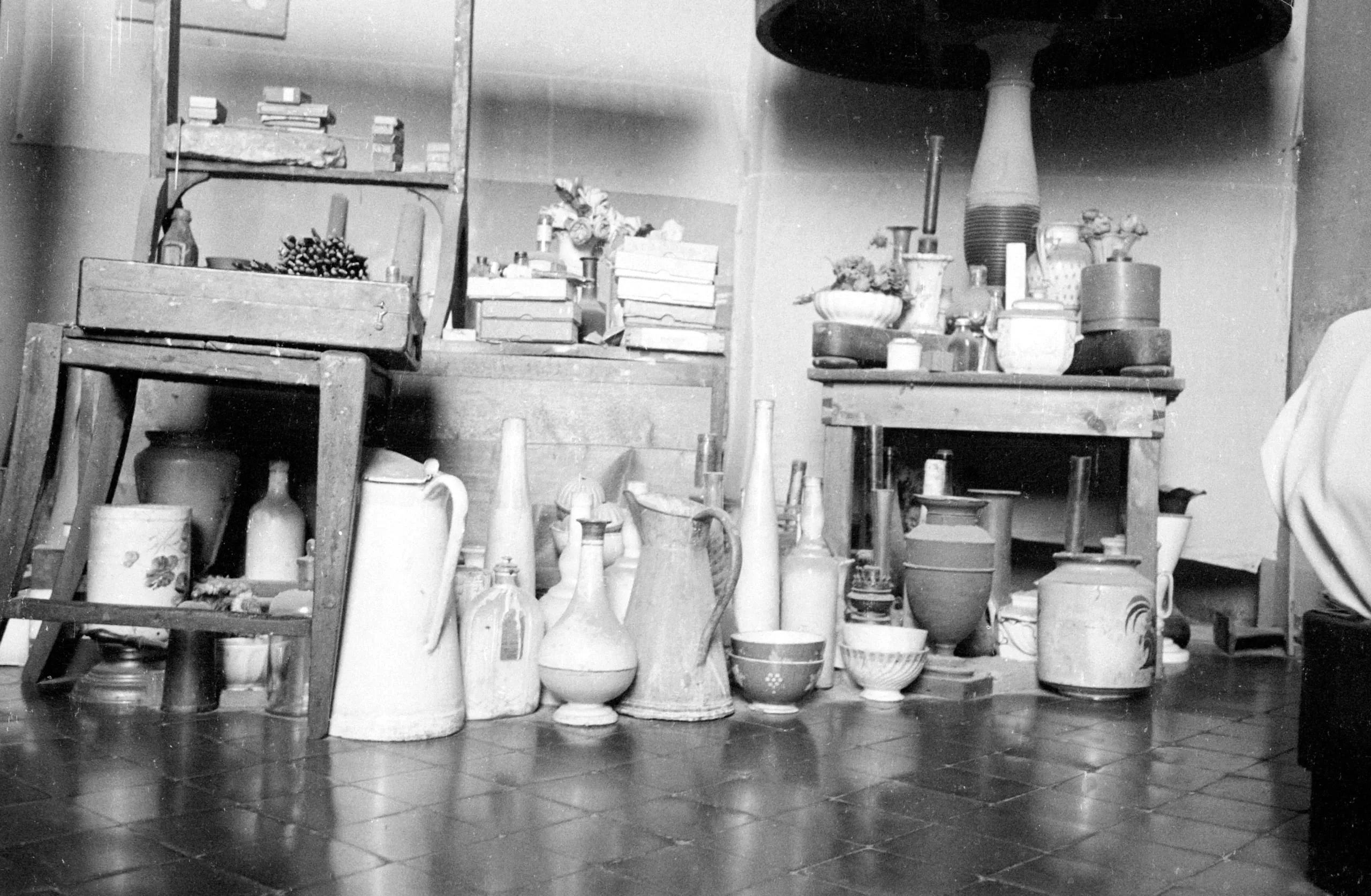Black and white photograph of a crowded studio interior with ceramic jugs, bottles, and bowls arranged on a tile floor and wooden worktables