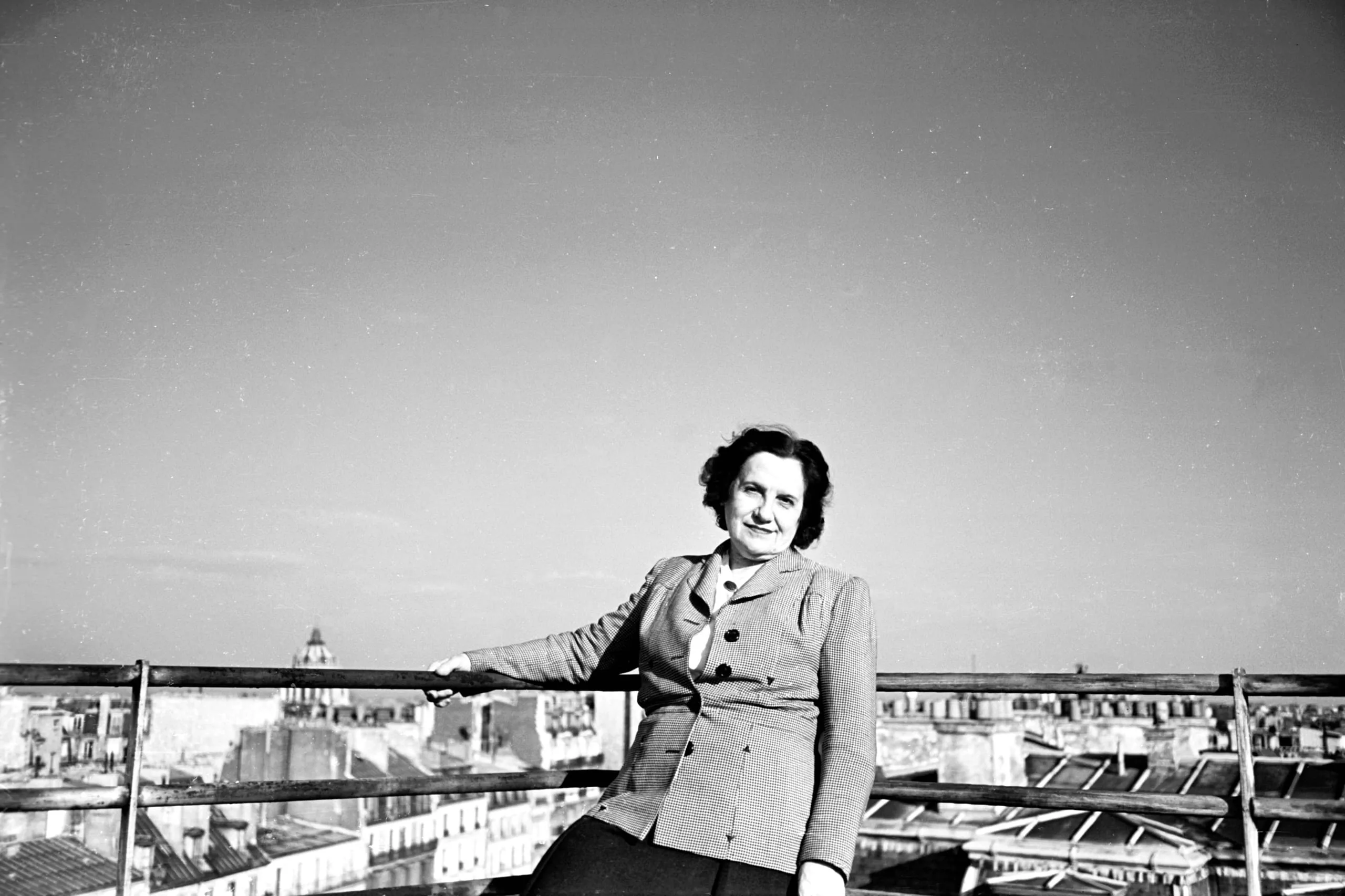 Black and white photograph of a white woman in a fitted blazer leaning on a rooftop railing with a city skyline behind her
