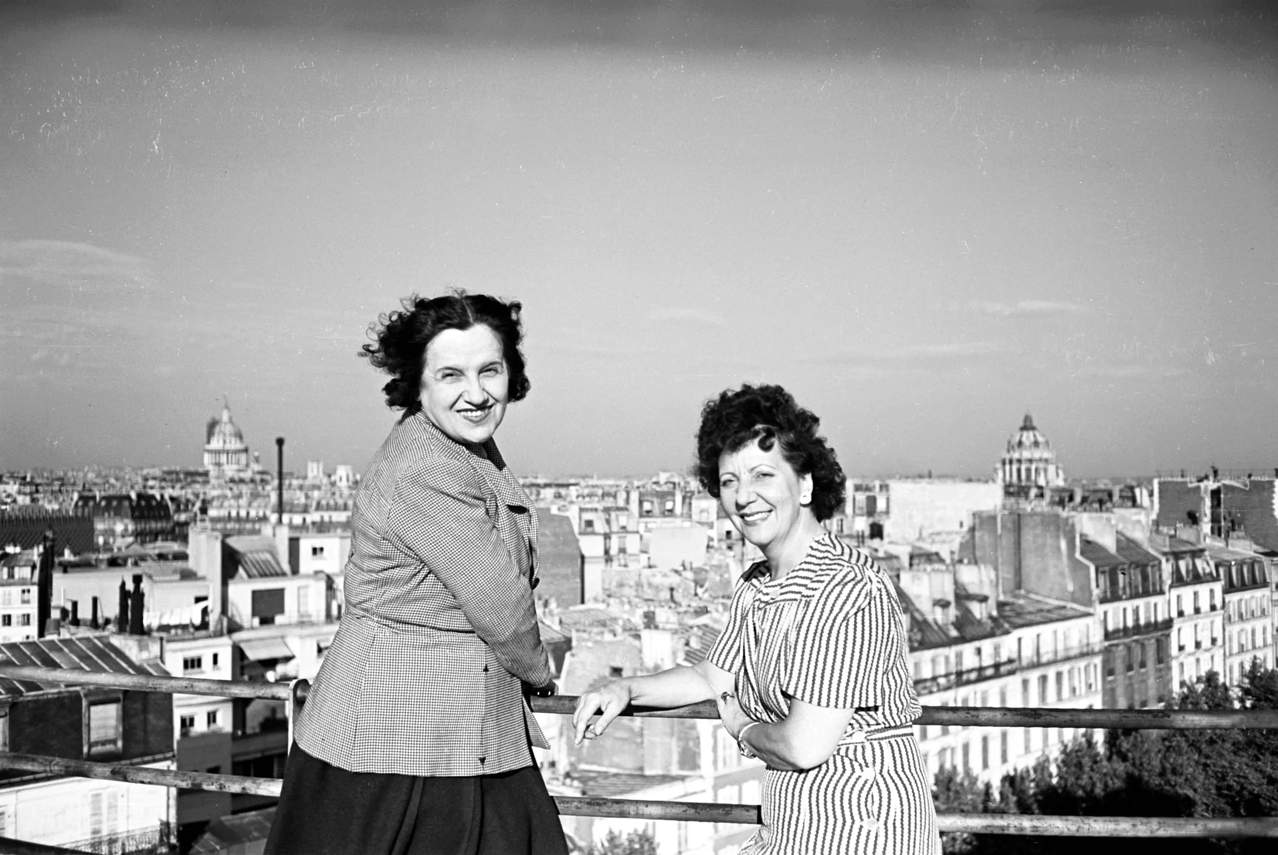 Black and white photograph of two smiling women leaning on a rooftop railing with a Parisian skyline and domed buildings in the distance