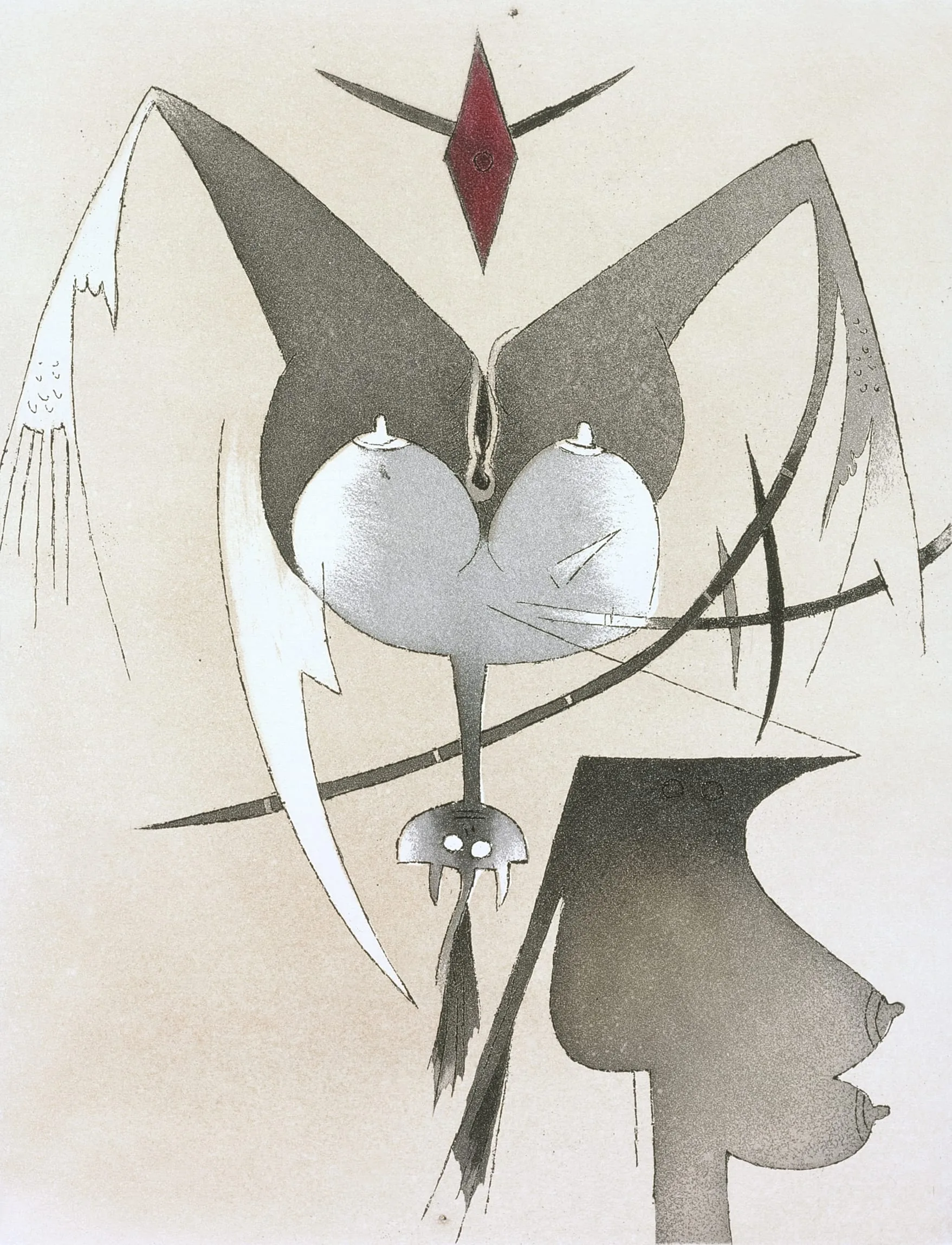 Vertical print in gray wash and black ink with a single red accent, depicting a fantastical abstract figure with horn-like wings, spherical forms, and a human silhouette in profile at lower right