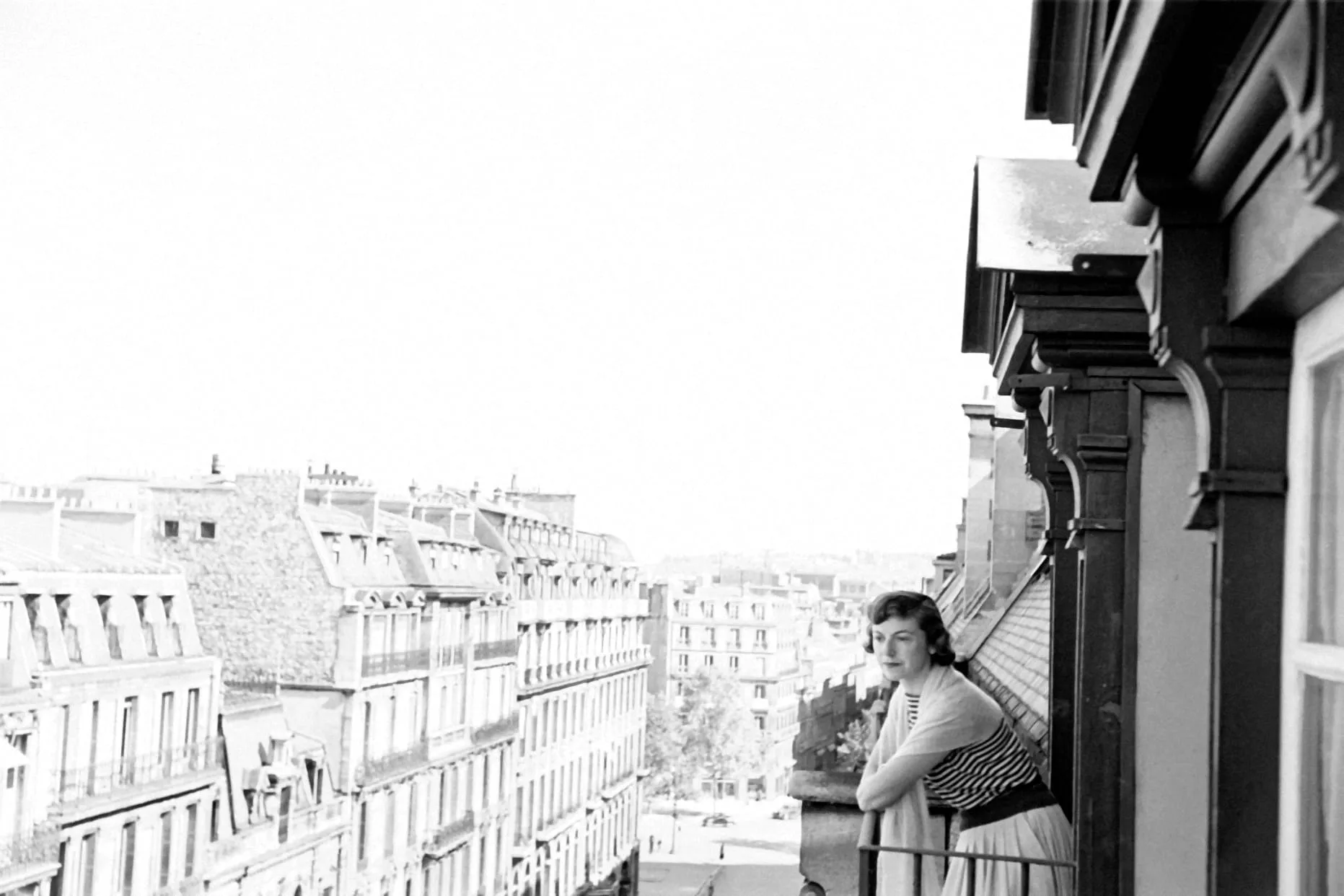 Black and white photograph of a white woman in a striped top leaning on a balcony railing, overlooking a wide Parisian boulevard lined with Haussmann-style buildings