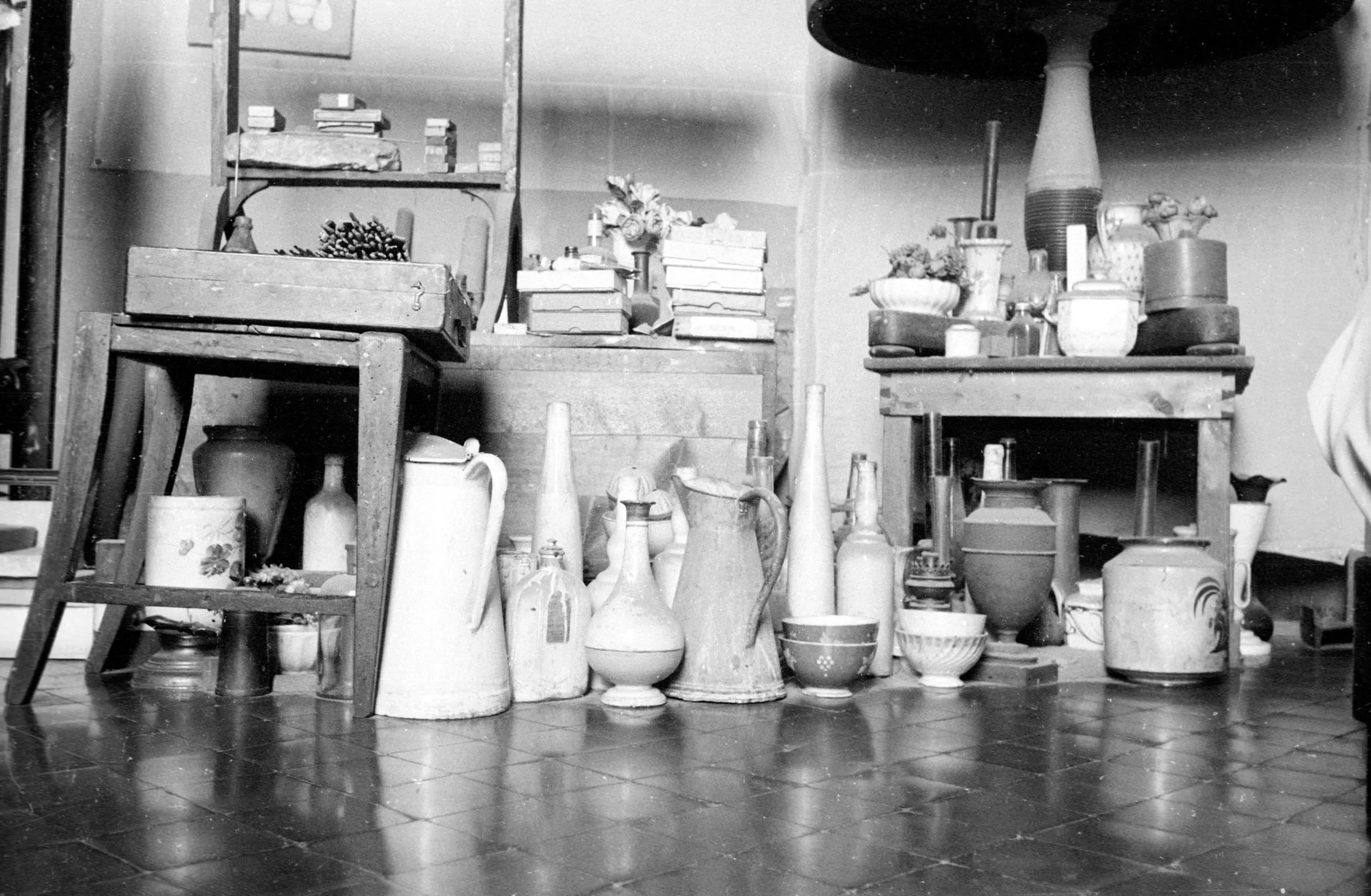 Black and white photograph of a cluttered studio interior with a row of ceramic pitchers, jugs, and bottles on a tiled floor, with wooden shelves and tables holding more vessels and potted plants behind