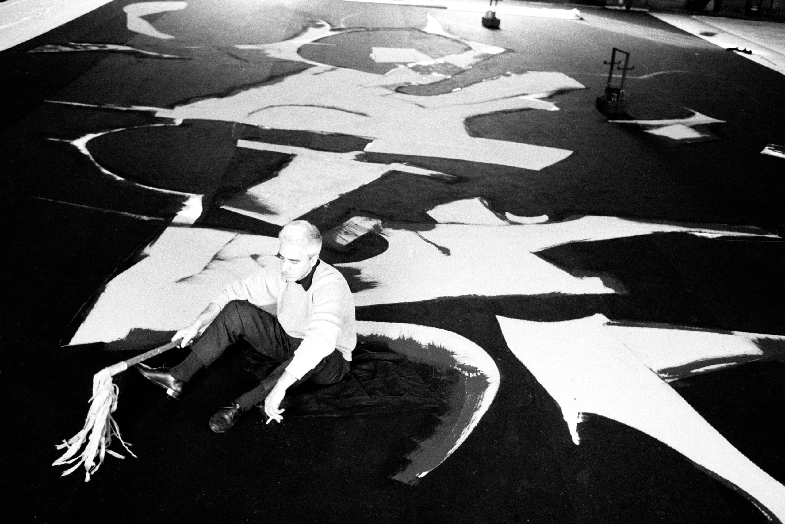 Black and white photograph looking down at a man sitting on a large floor-spanning abstract painting of bold white brushstrokes on black, holding a mop-like brush