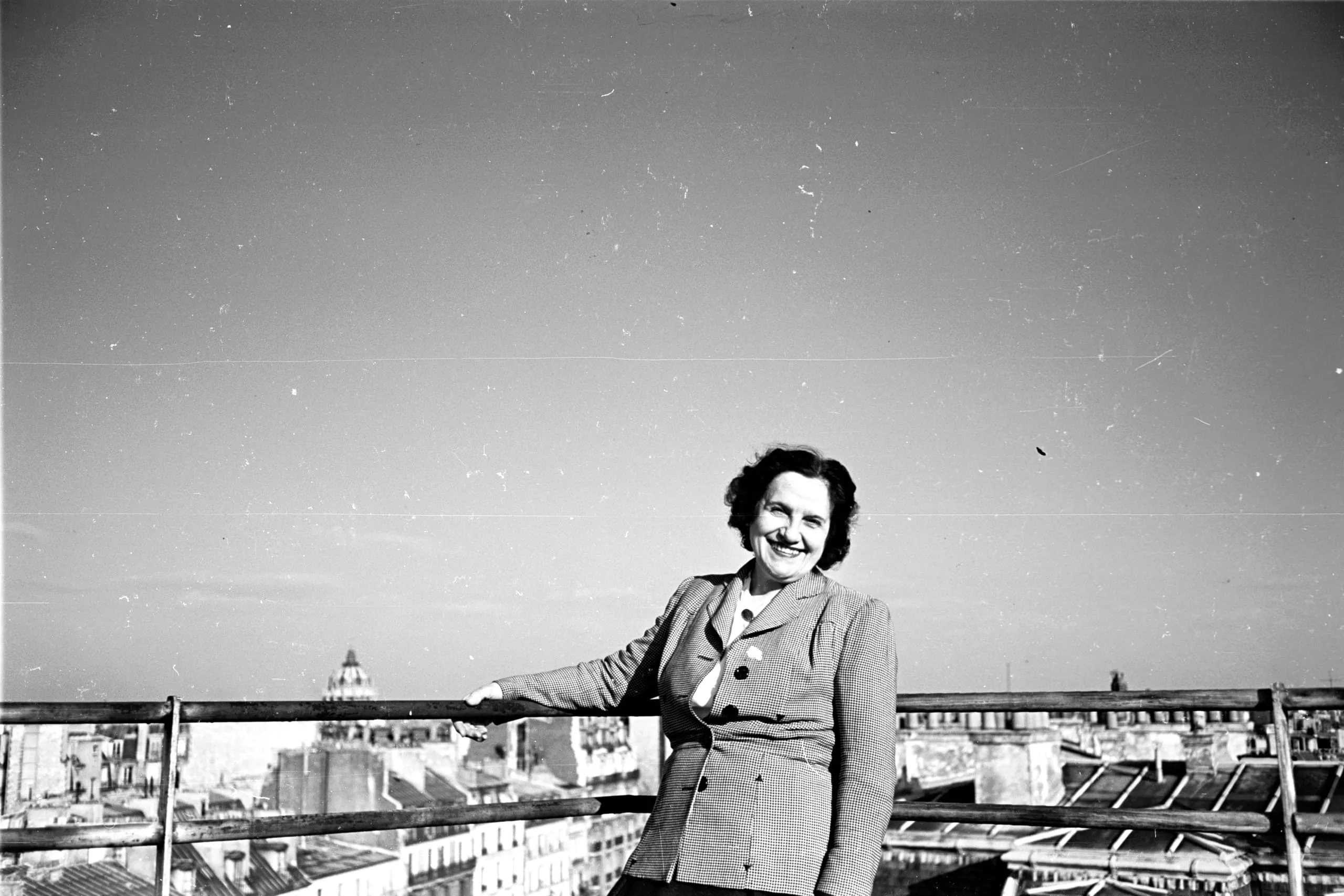 Black and white photograph of a smiling white woman in a fitted double-breasted jacket leaning on a metal railing on a rooftop terrace, with a city skyline behind her