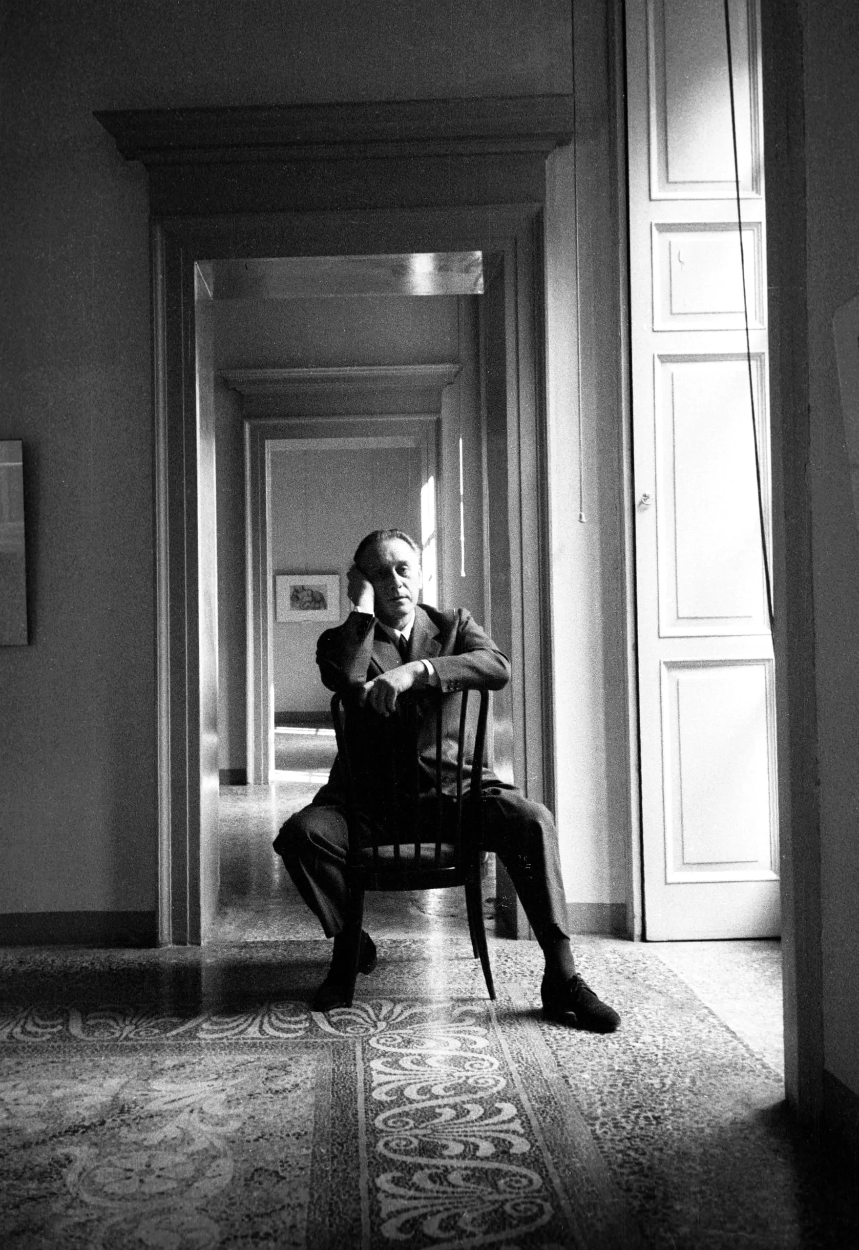 Black and white photograph of a man in a dark suit seated on a wooden chair in a doorway, leaning his cheek on one hand, with a receding enfilade of rooms behind him