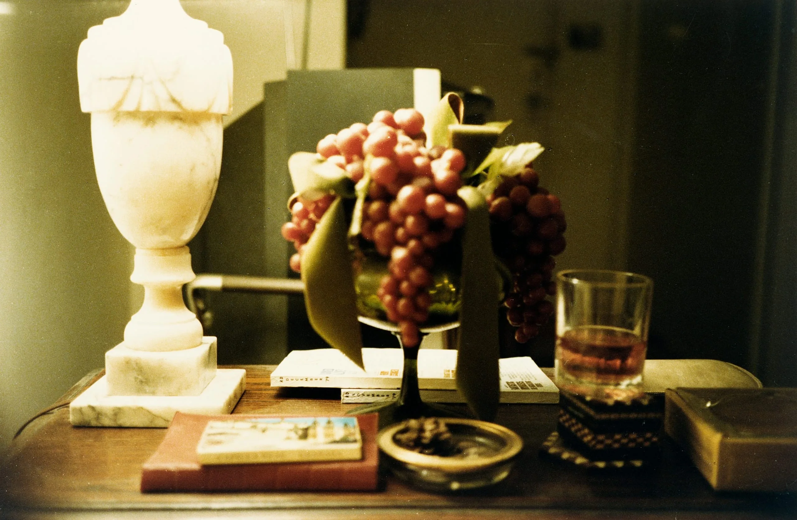 Color photograph of a tabletop arrangement including a marble urn lamp, artificial grape cluster in a compote, a glass tumbler, matchbooks, and small decorative objects, warm amber film tones