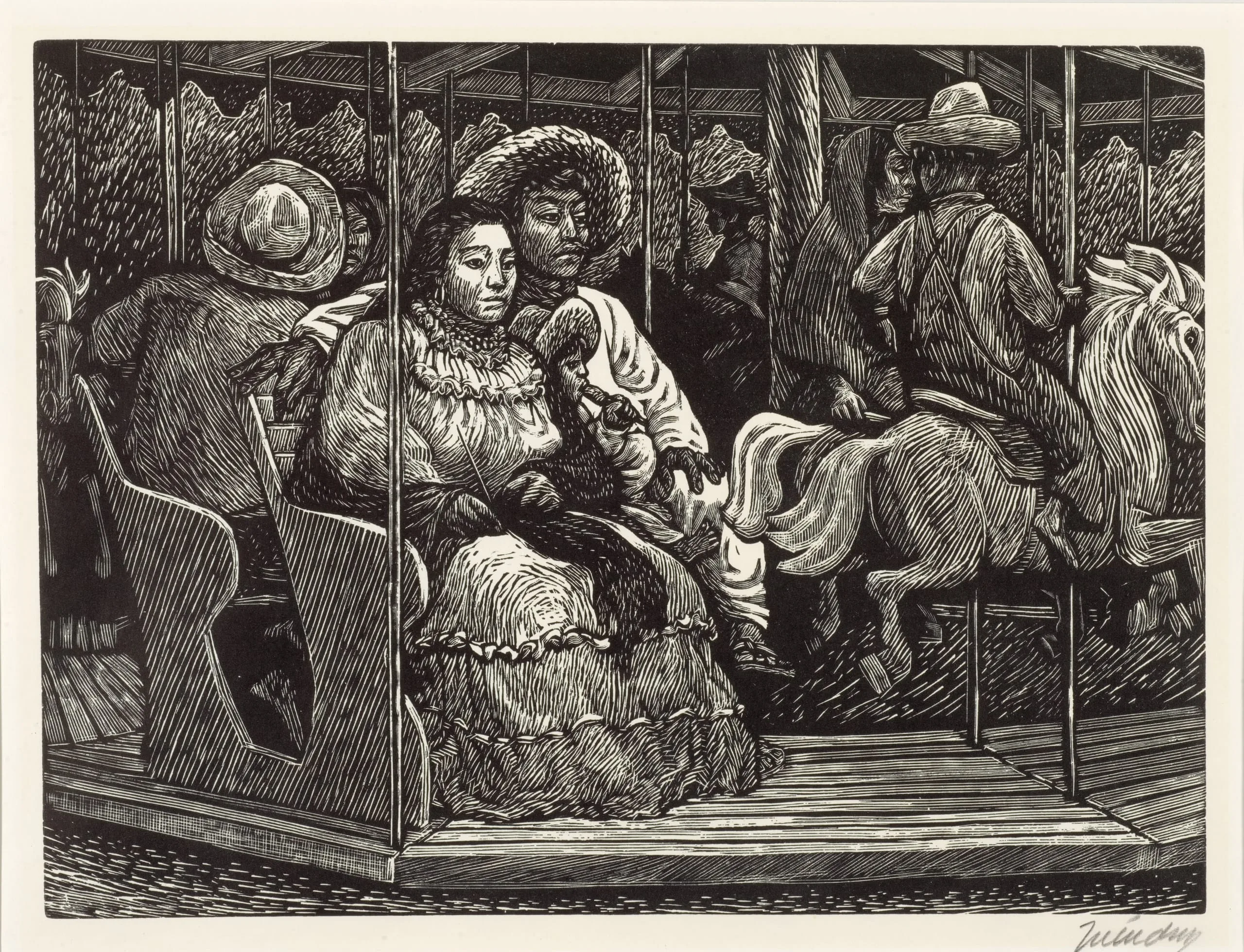 Leopoldo Méndez created this linocut for the opening credits of the film Pueblerina, directed by Emilio Fernández (1904–1986) and shot by Gabriel Figueroa (1907–1997)—two greats of the Golden Age of Mexican cinema. Film collaborations offered a new creative avenue to Méndez, who had long aspired to make graphic murals and to create prints on a monumental scale. While other images from the film depict scenes of labor or hardship, here Méndez illustrates a melancholic moment of leisure.