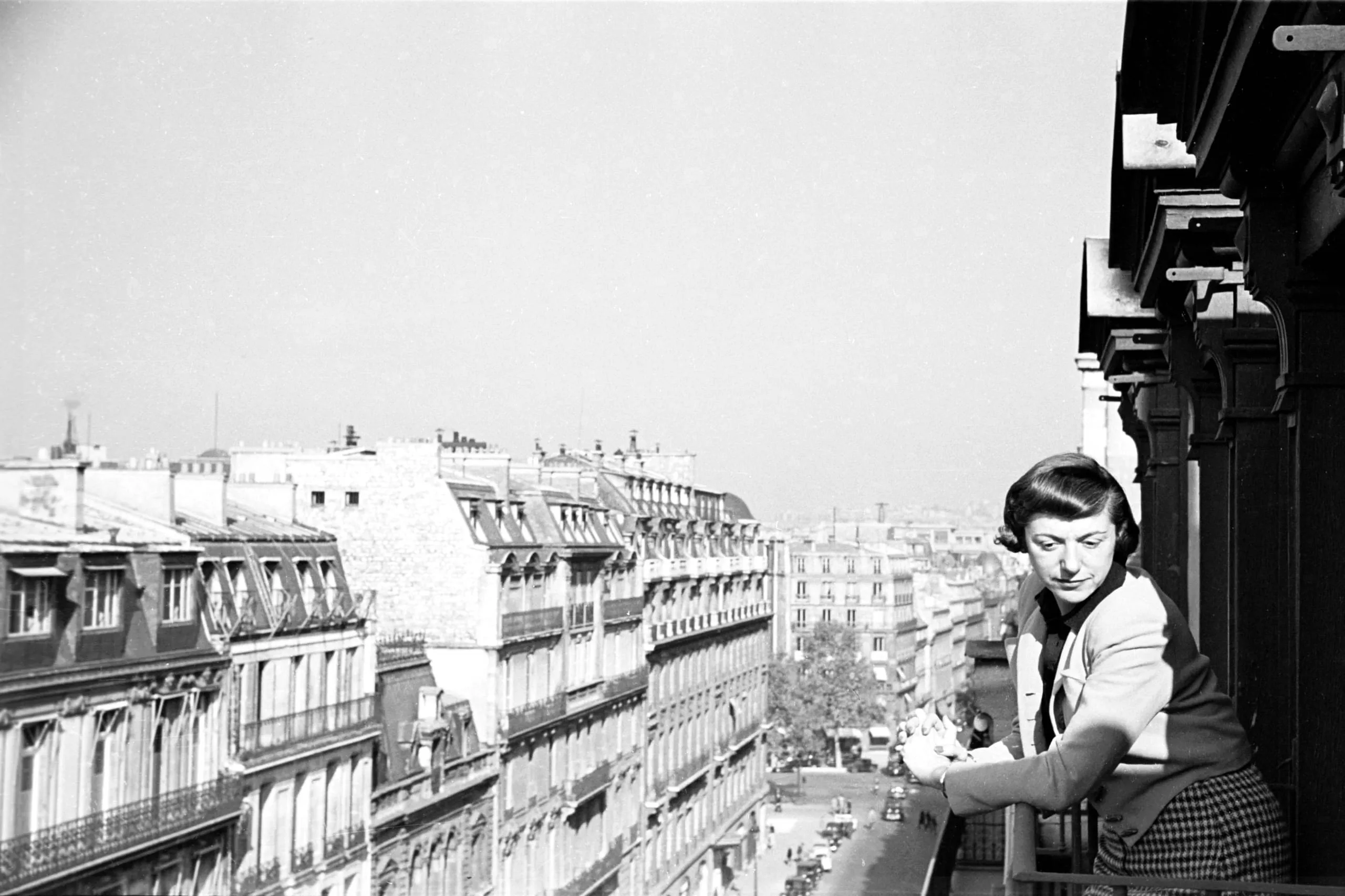 Black and white photograph of a white woman leaning on a balcony railing above a wide Parisian boulevard lined with Haussmann-era buildings
