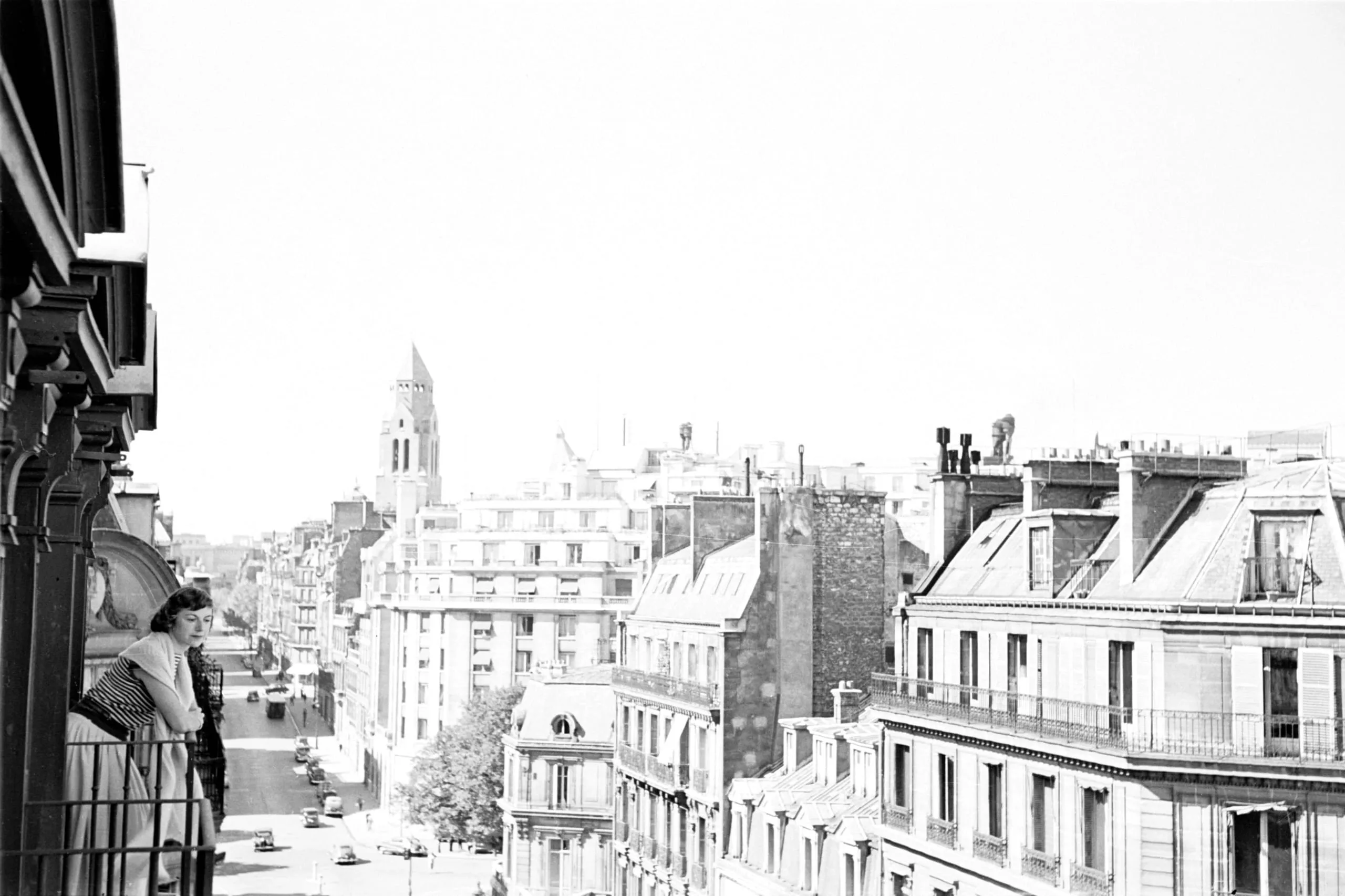 Black and white photograph of a woman leaning on a high balcony overlooking a wide Parisian boulevard lined with Haussmann-style buildings and leafy trees