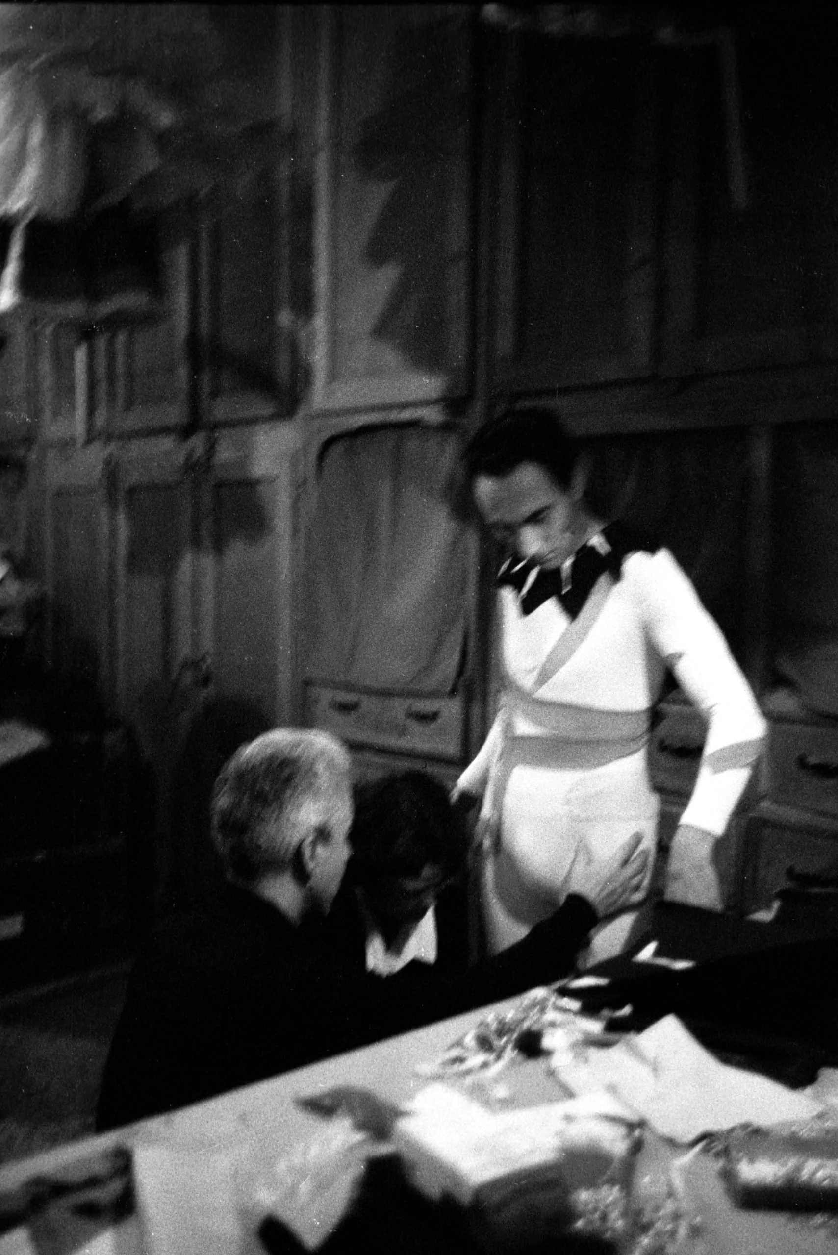 Black and white photograph, three figures in a dim room — two seated at a table and one standing in a white wrap costume with a black bow tie