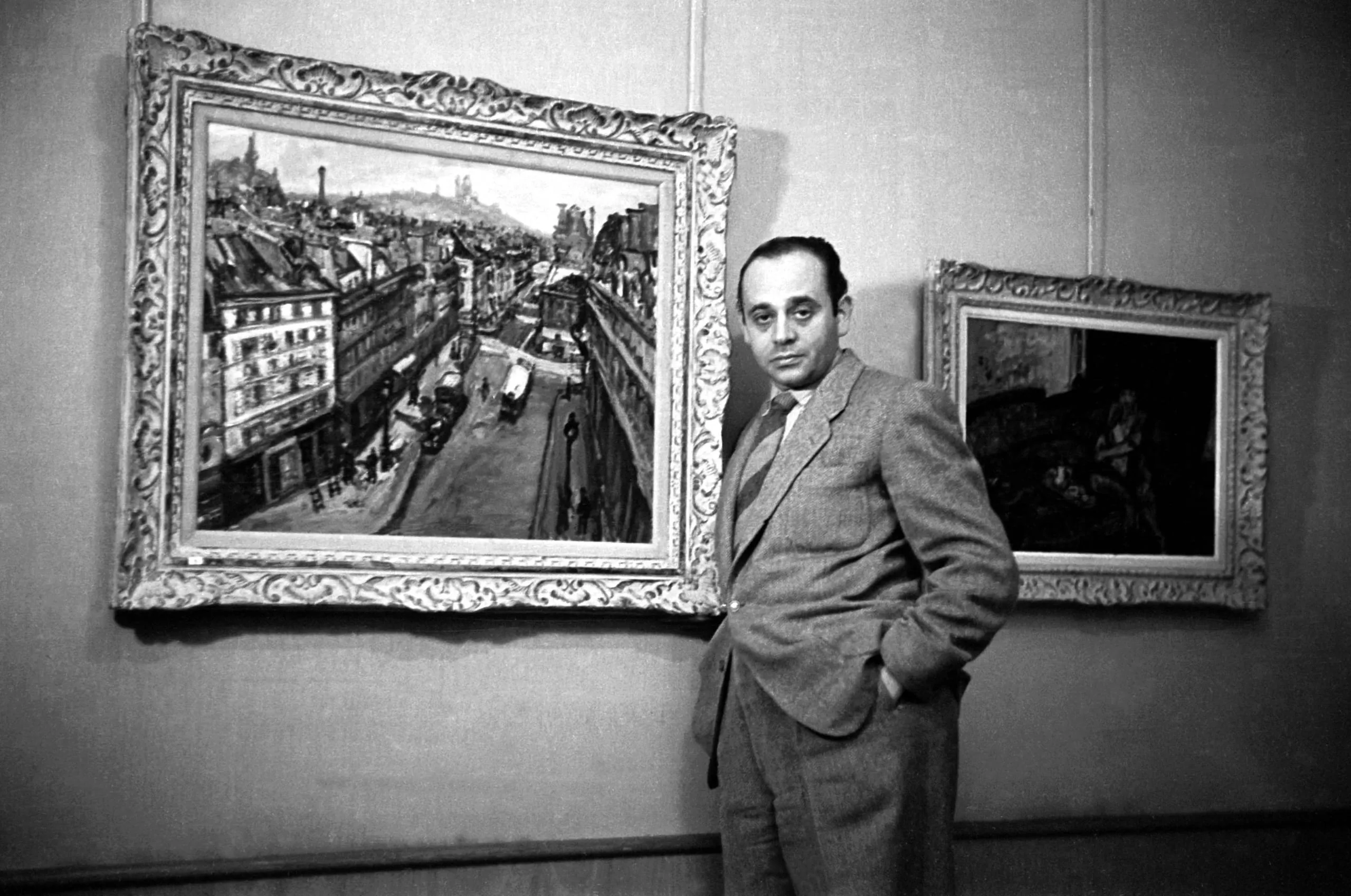 Black and white photograph of a man in a suit standing in a gallery beside a large framed urban street-scene painting