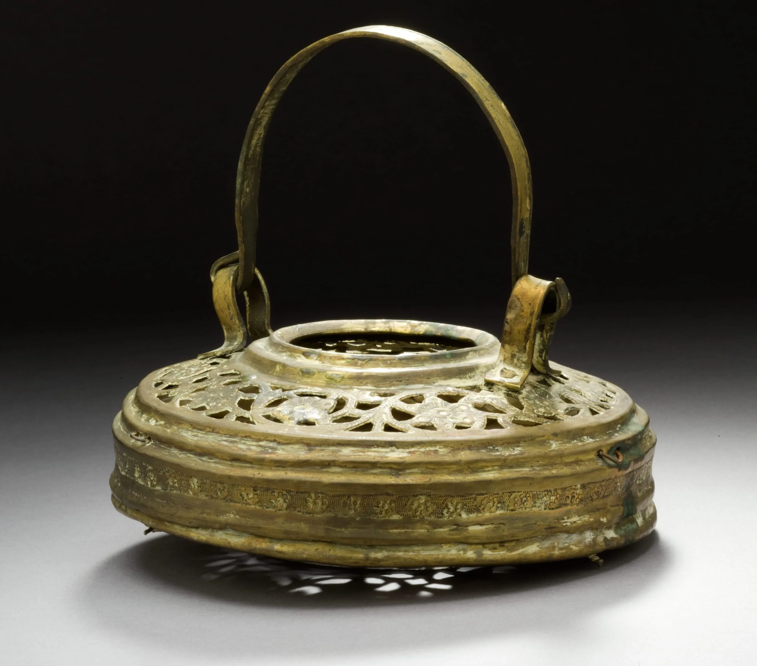 Bronze warming vessel with flat, disc-shaped body, openwork lid with leaf cutouts, relief-decorated band, and tall arching swing handle, with olive-green patina