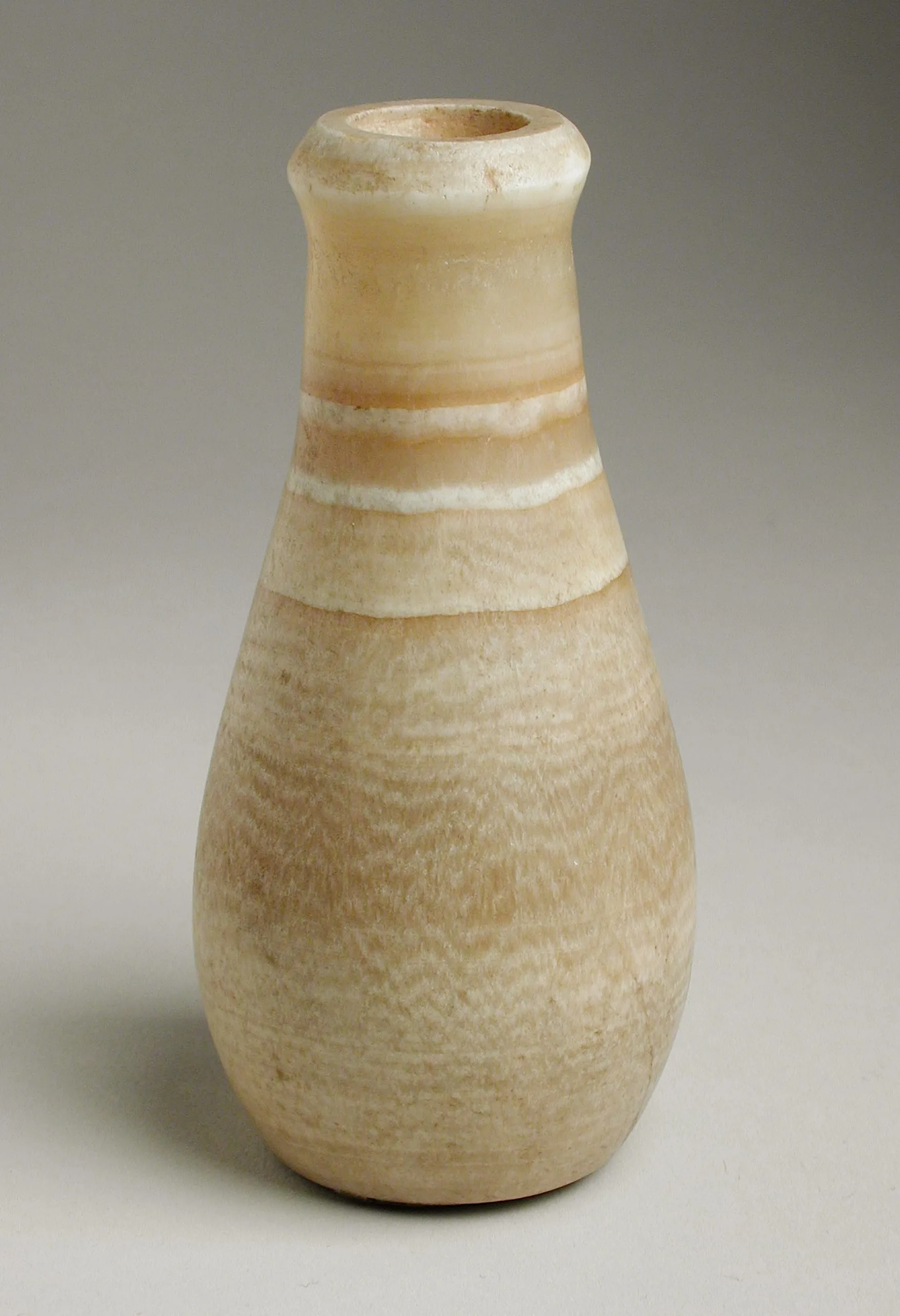 Small carved alabaster vessel with a rounded pear-shaped body, short cylindrical neck, and two white horizontal bands at the shoulder