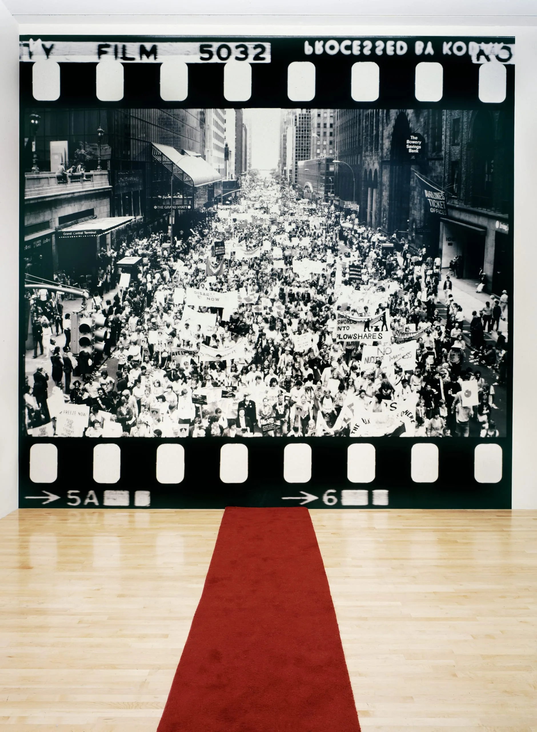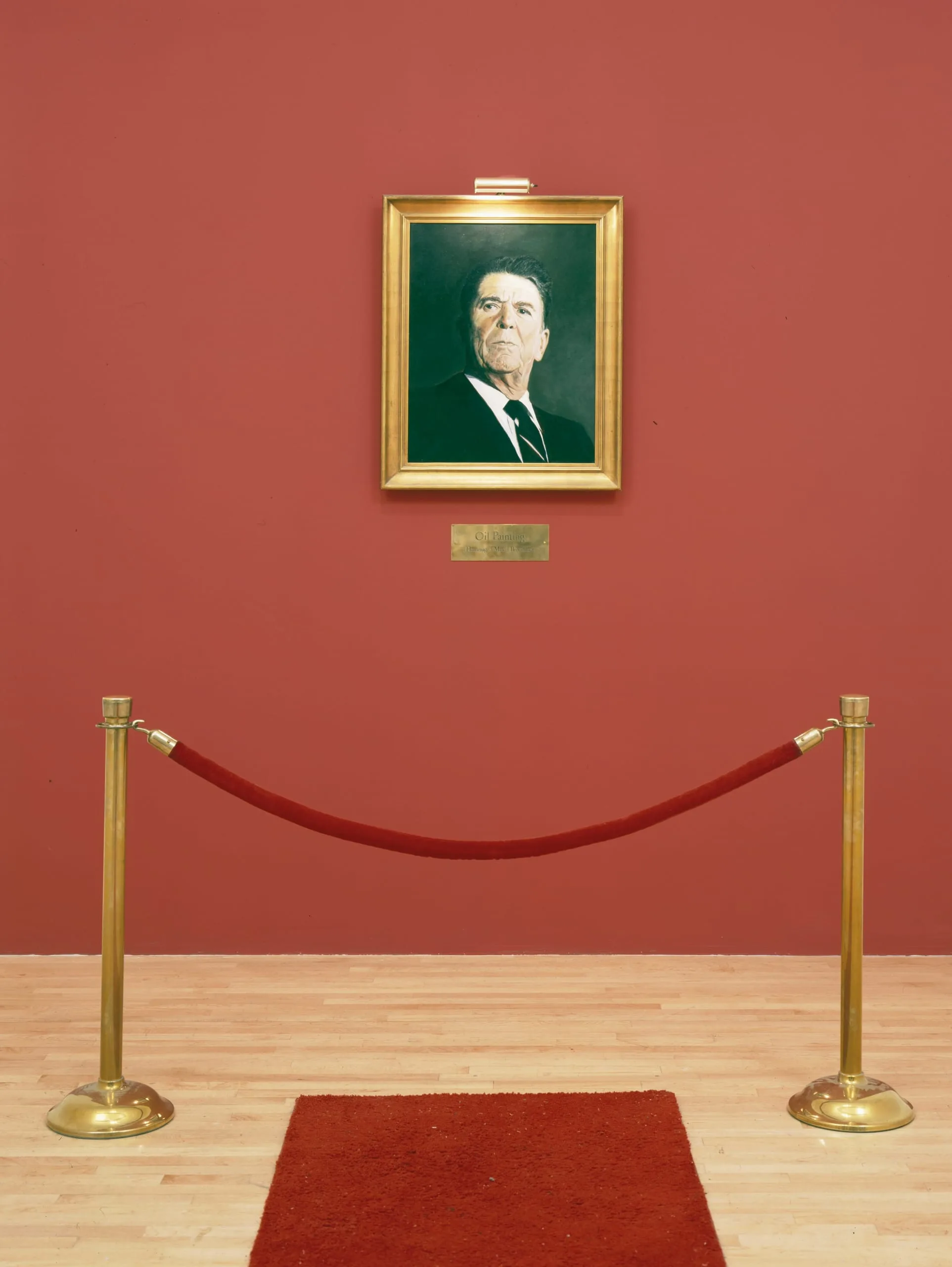- Oil on canvas, stanchions with velvet rope, red carpet, photo mural