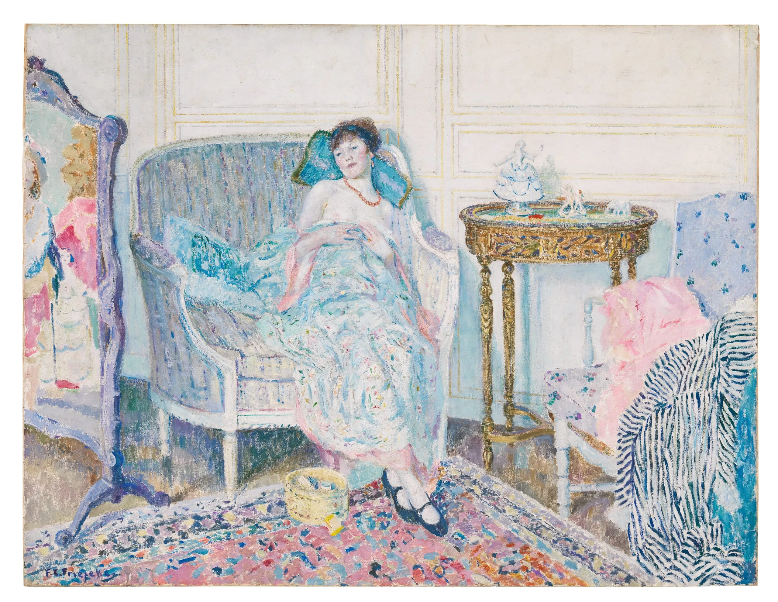 In the Boudoir is typical of the many informal interior scenes Frieseke painted throughout his career. Although he much preferred to paint outdoors, the American public of the 1910s more readily bought his boudoir scenes of women involved in their toilette or in some other feminine activity. The artist’s wife, Sarah, better known as Sadie, usually posed as his model in their home. In this painting, as in many of Frieseke’s interiors of the 1910s, the model lounges in a room decorated with elegant French rococo furniture and an oriental carpet. In contrast to the figure’s restful pose, the scene is alive with decorative patterning. Frieseke’s interior is similar to those by Edouard Vuillard (18681940). Both artists often presented their figures in corners of rooms, viewing them diagonally and from a slightly elevated viewpoint. The floor tilts up, flattening the space of the room and thereby emphasizing the painting as an arrangement of flat shapes and patterns. Frieseke differed from Vuillard in his tendency to present his models more intimately attired or involved in more personal activities. In Torn Lingerie, 1915 (Saint Louis Art Museum), the model reveals her lovely leg while mending her slip, and in In the Boudoir she abandons her sewing basket to stretch out comfortably on the settee, allowing her kimono to slip off and expose her shoulders and breast.