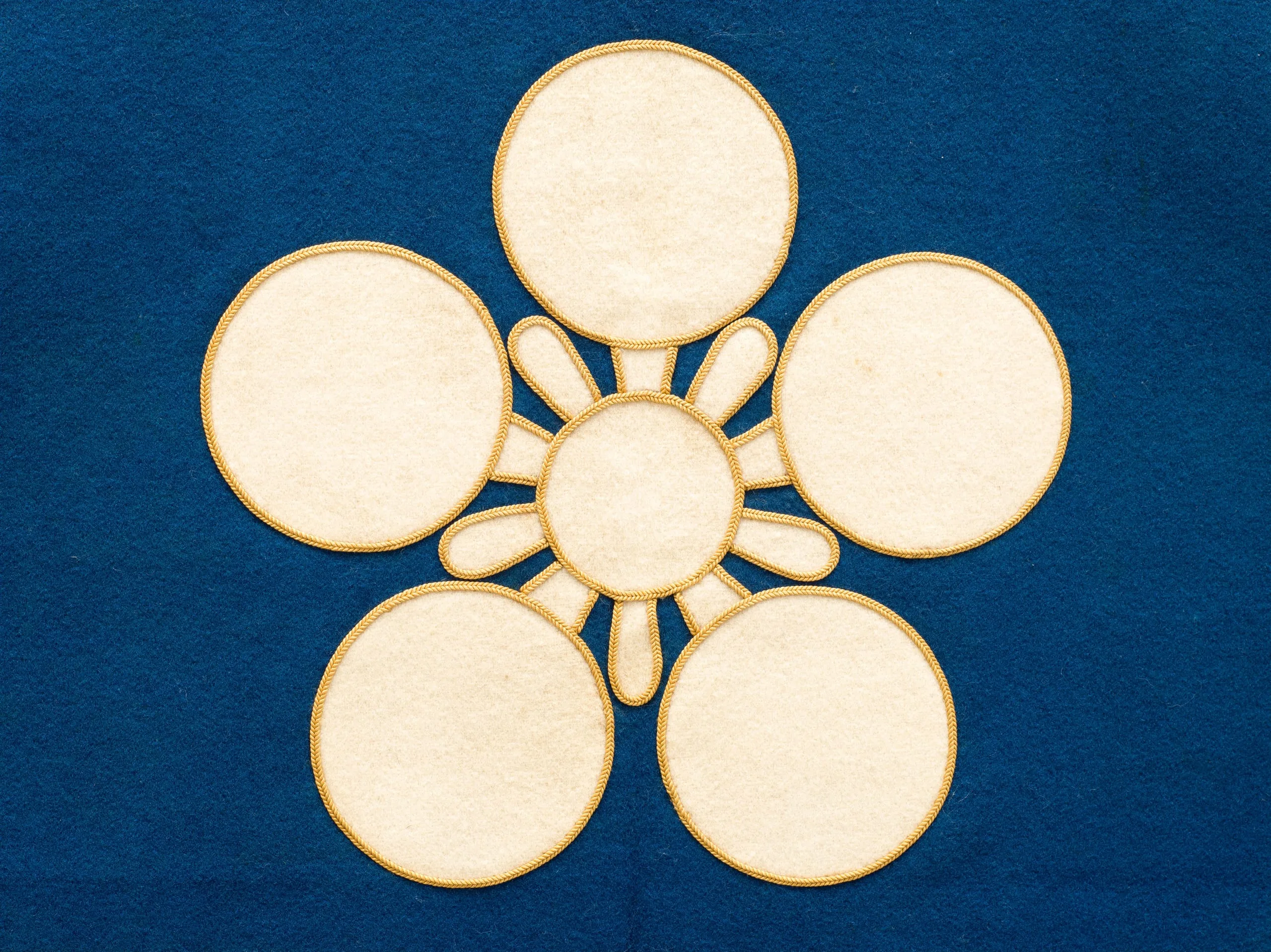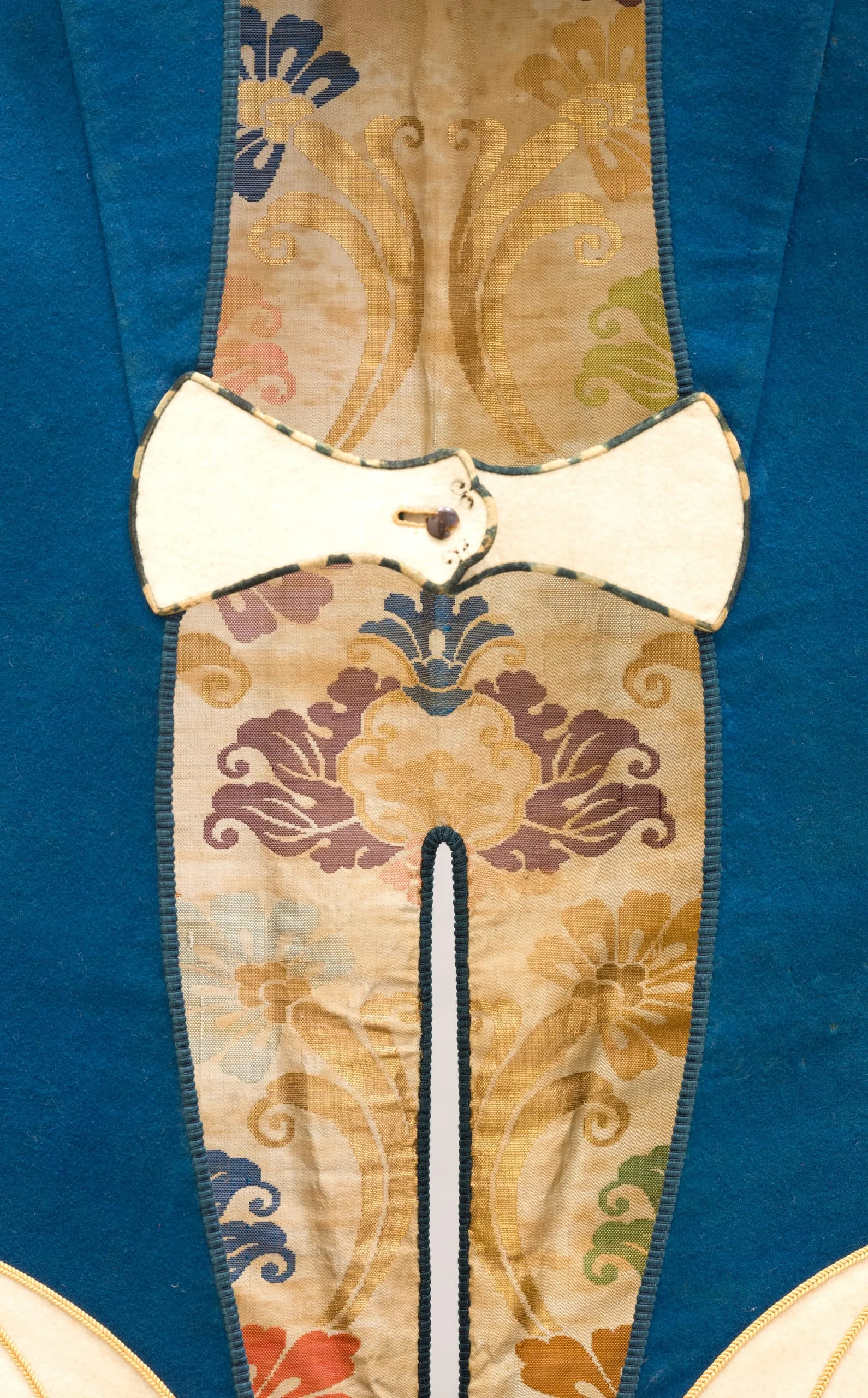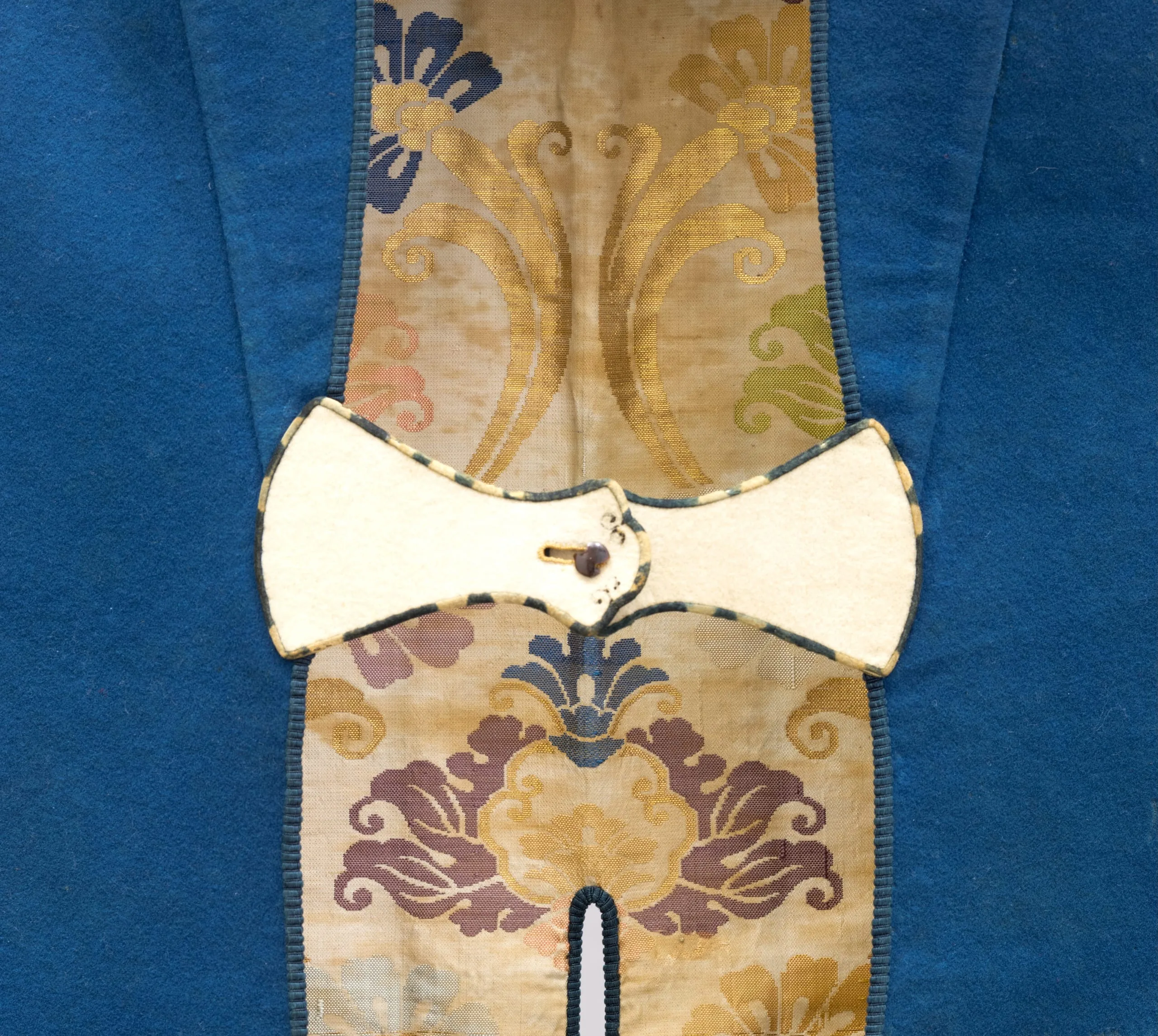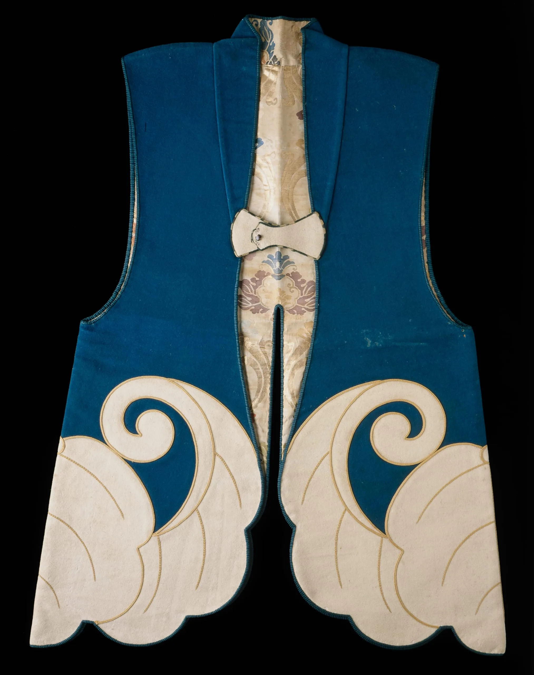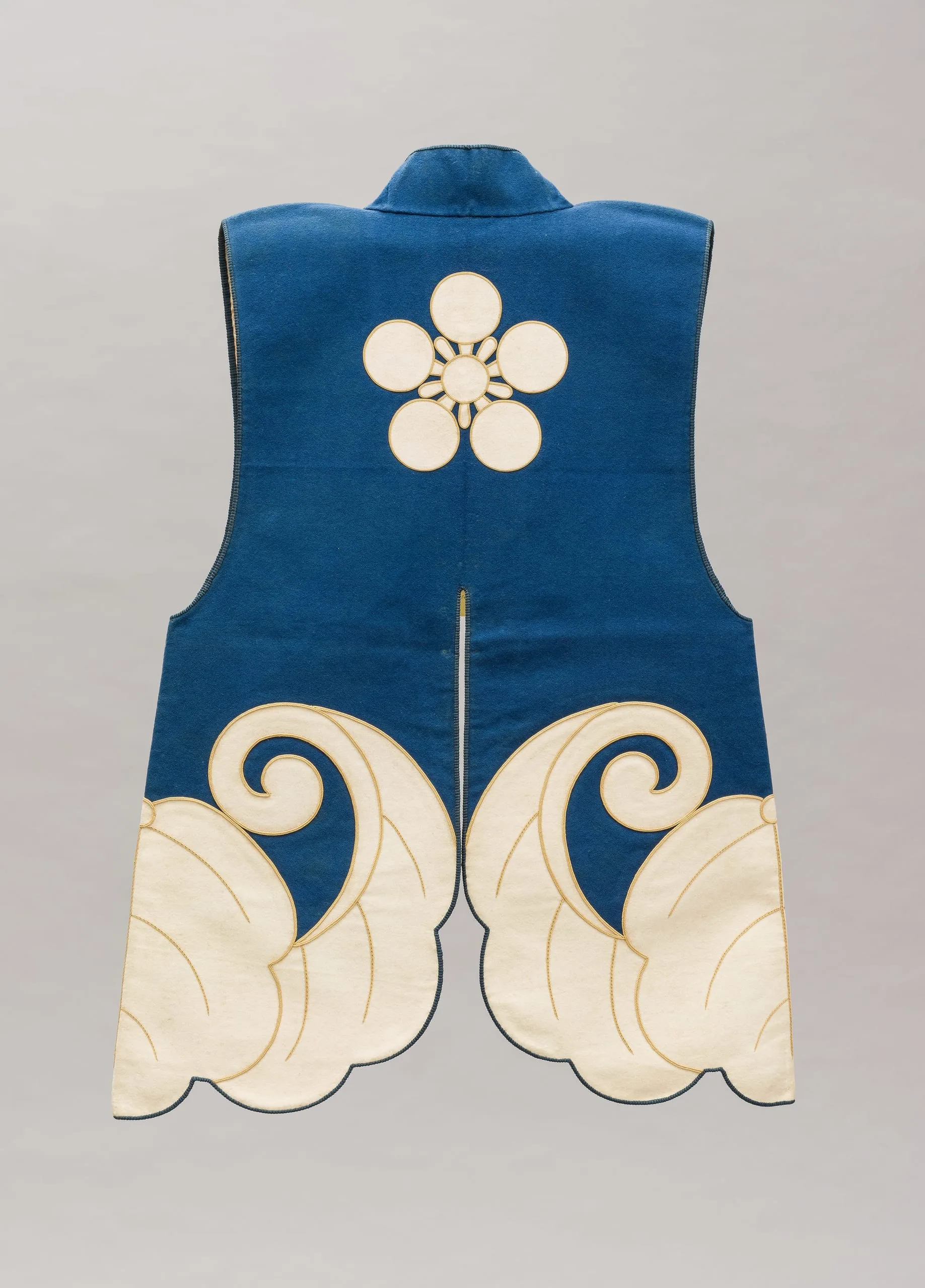 - Wool plain-weave, full finish (rasha), and wool appliqués with silk embroidery