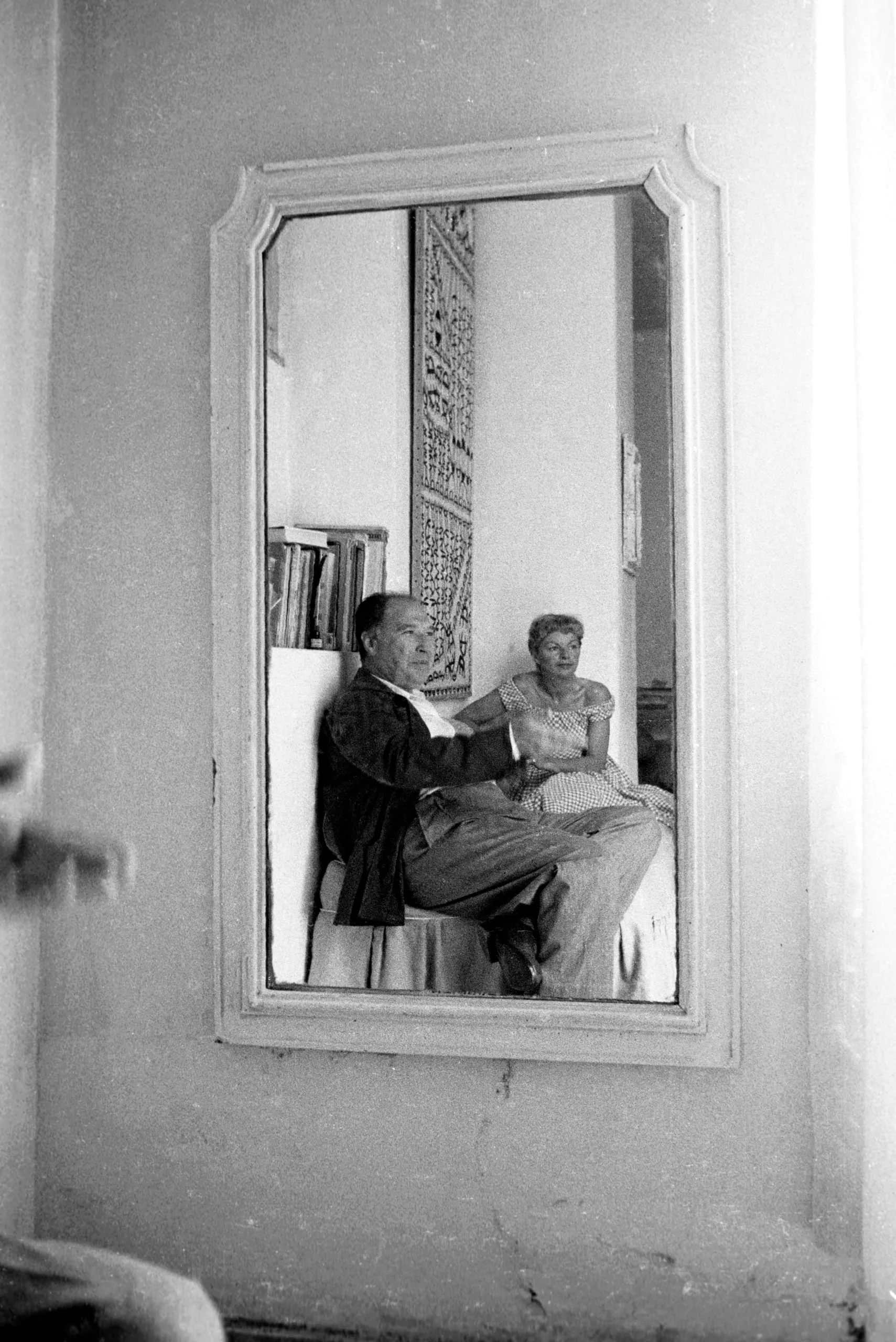 Black and white photograph of a wall mirror reflecting two people seated together — a heavyset man in a dark jacket and a woman in a patterned dress — with bookshelves and a wall hanging visible in the reflection