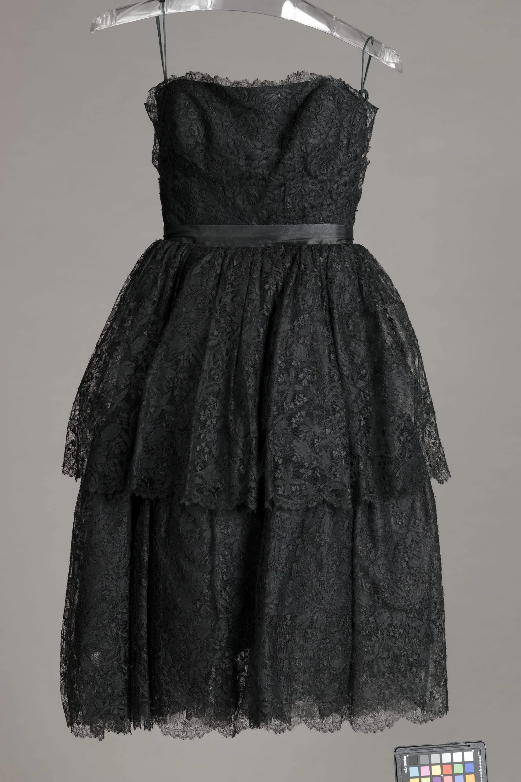 - Dress: silk plain weave (crepe), silk lace, silk satin ribbon