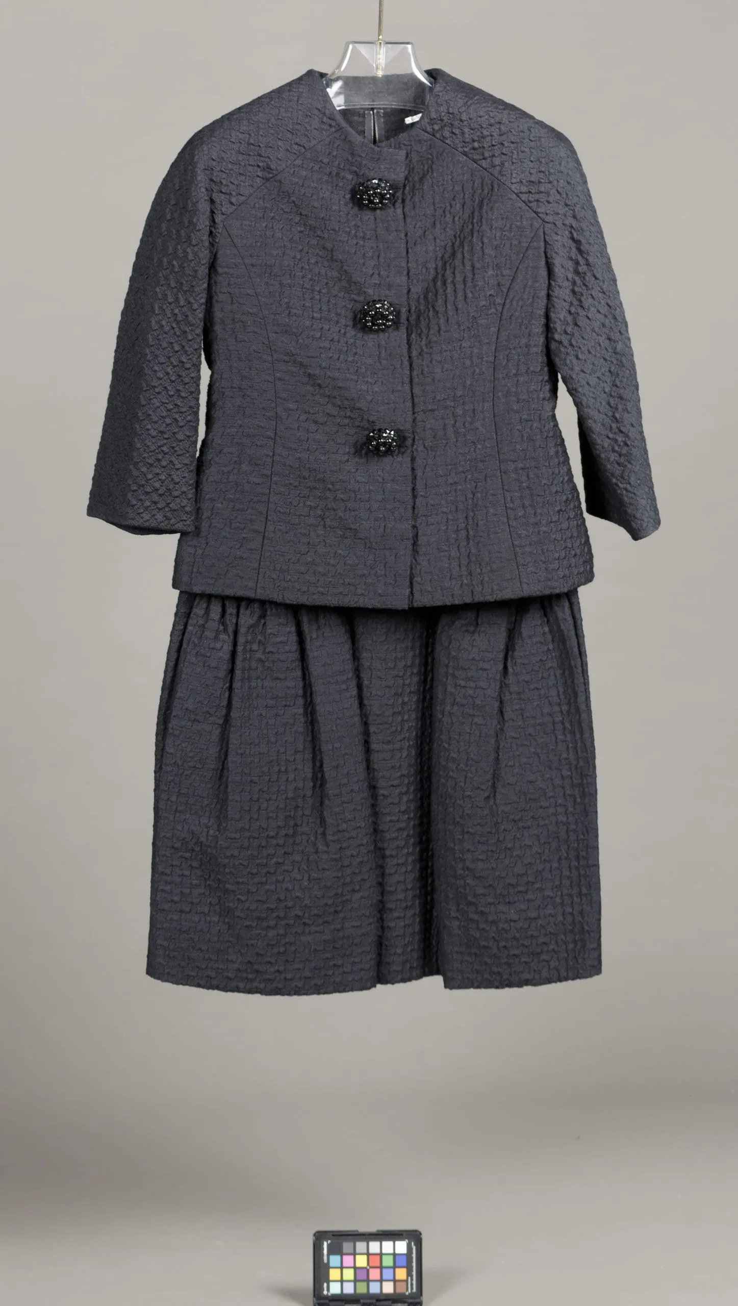 - Dress: silk double cloth (cloqué); Jacket: silk double cloth (cloqué) with plastic and glass buttons