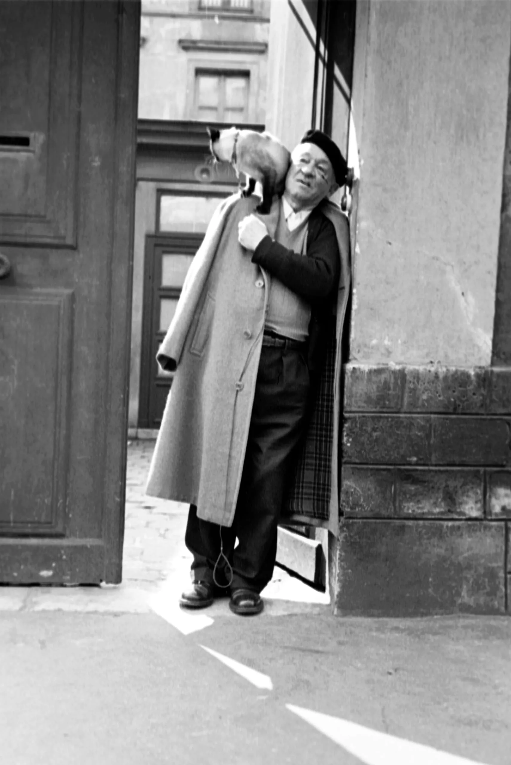 Black and white photograph, full-length view of an older man in a beret and dark trousers holding a long overcoat, a small dog perched on his shoulder