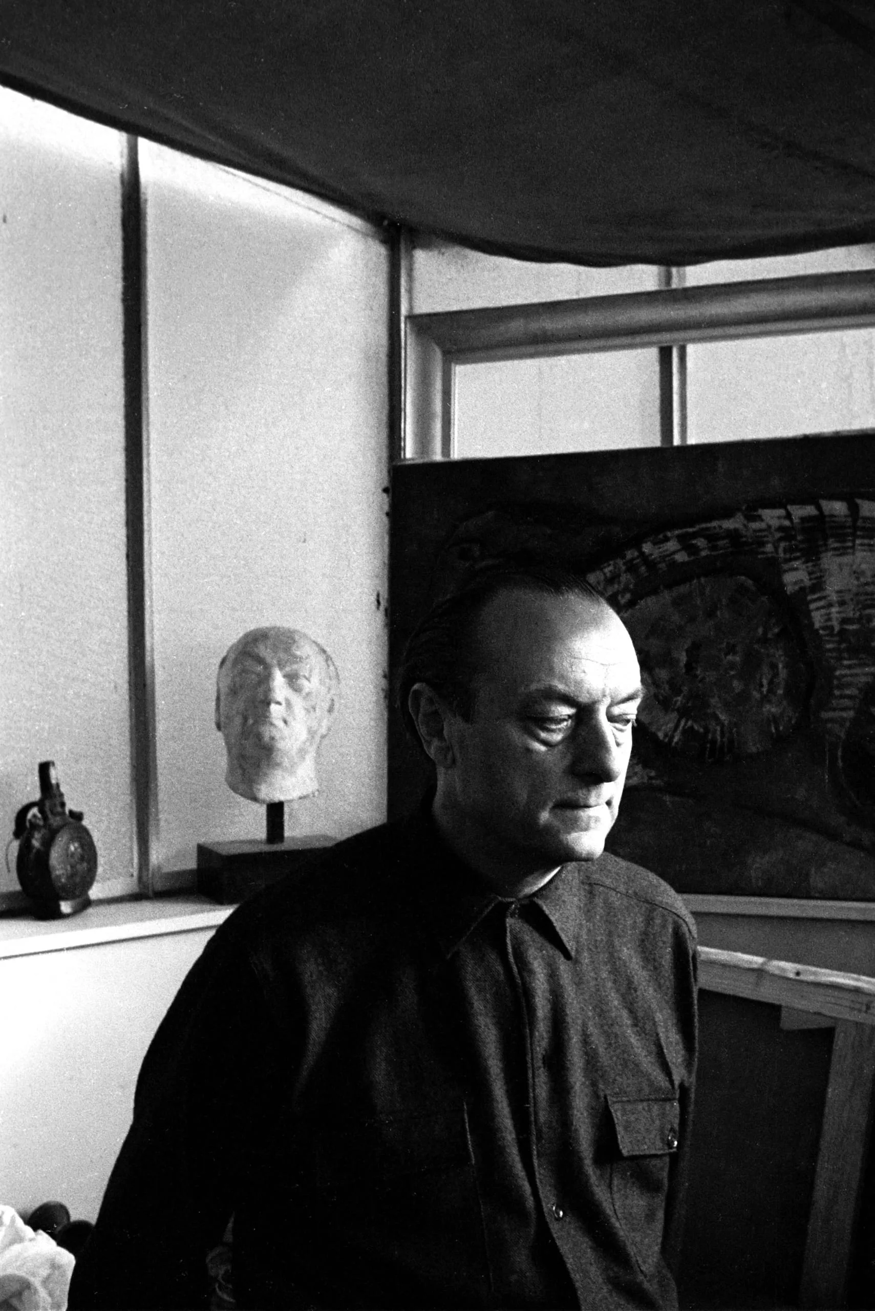 Black and white photograph of a man from the chest up in an artist's studio, with a sculpted plaster bust and large canvas visible behind him