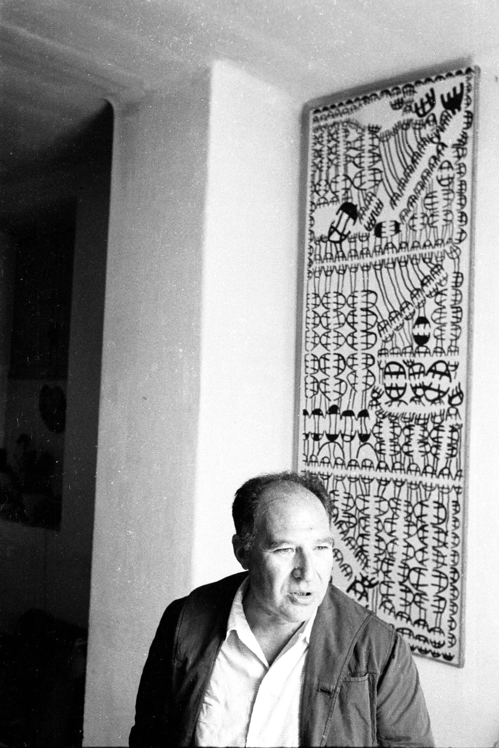 Black and white photograph of a man from the chest up, facing right, standing before a wall-hung textile dense with rows of small symbolic figures and glyphs
