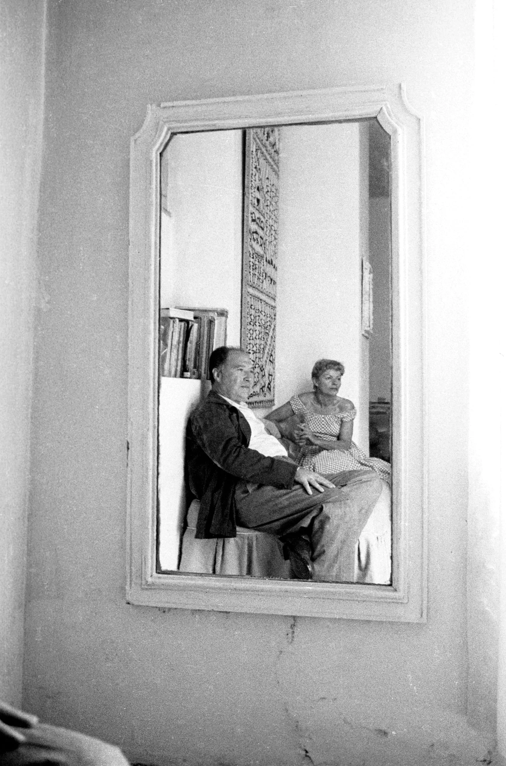 Black and white photograph of a mirror on a plaster wall, reflecting a heavyset bald man and a woman seated together in an interior room