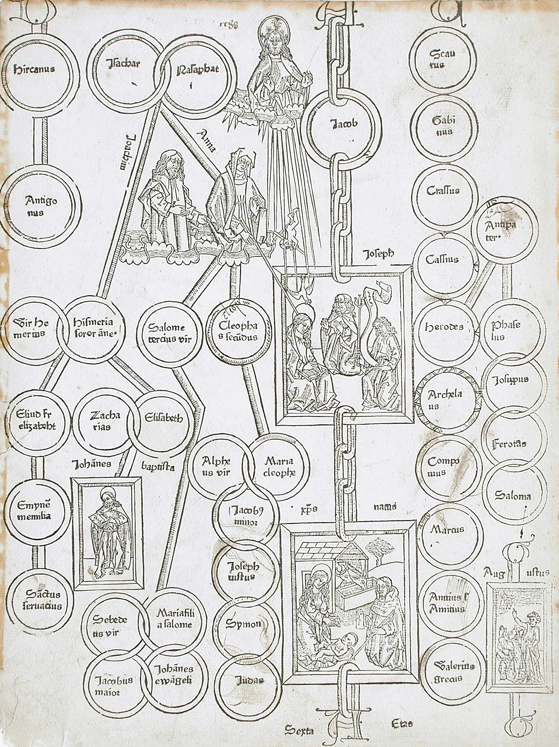 Woodcut genealogical diagram with interlocking circular medallions connected by chain links, Latin names, standing figures, and two small narrative scenes