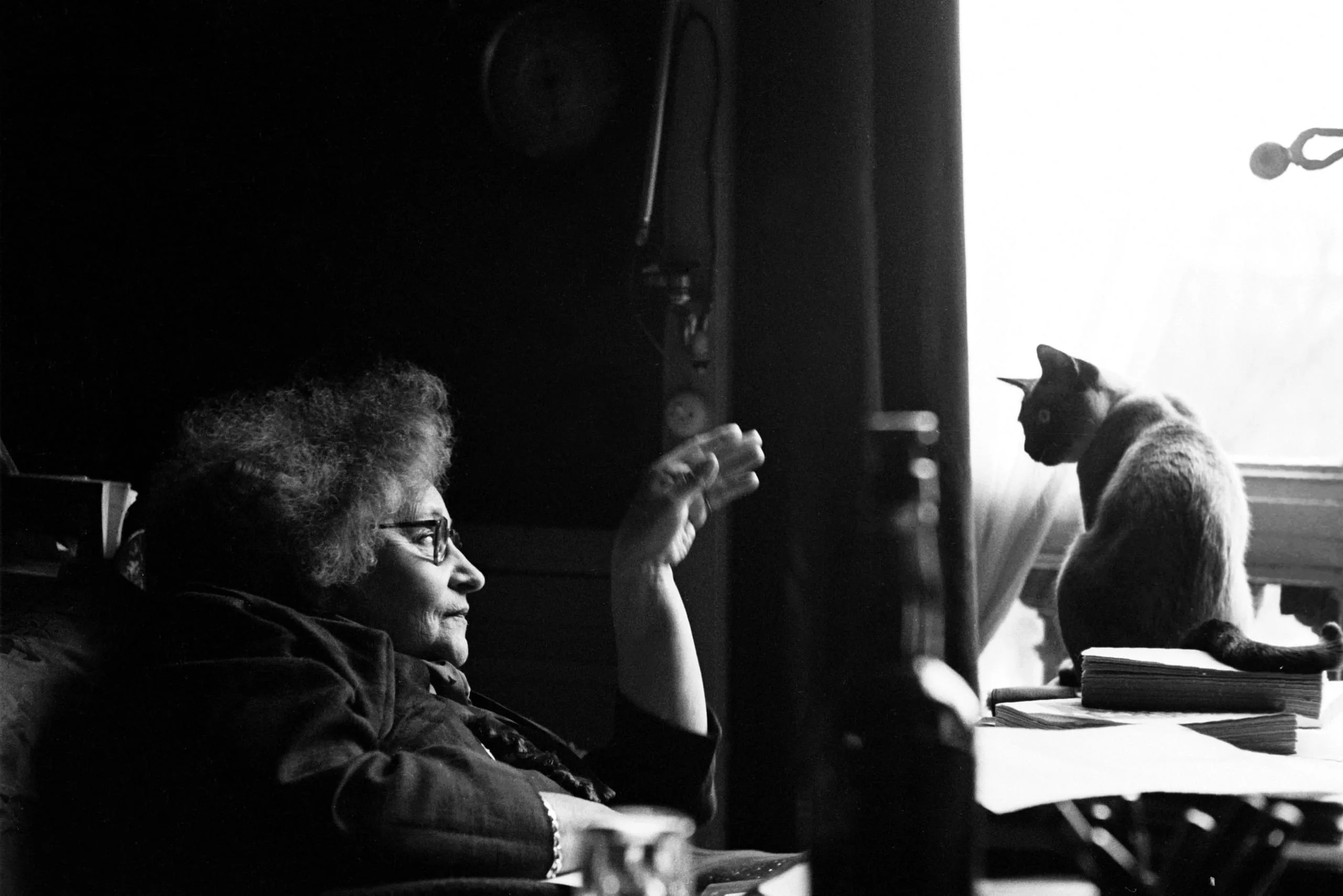 Black and white photograph of an older woman in glasses shown in profile, hand raised, facing a Siamese cat perched on a windowsill in high-contrast light
