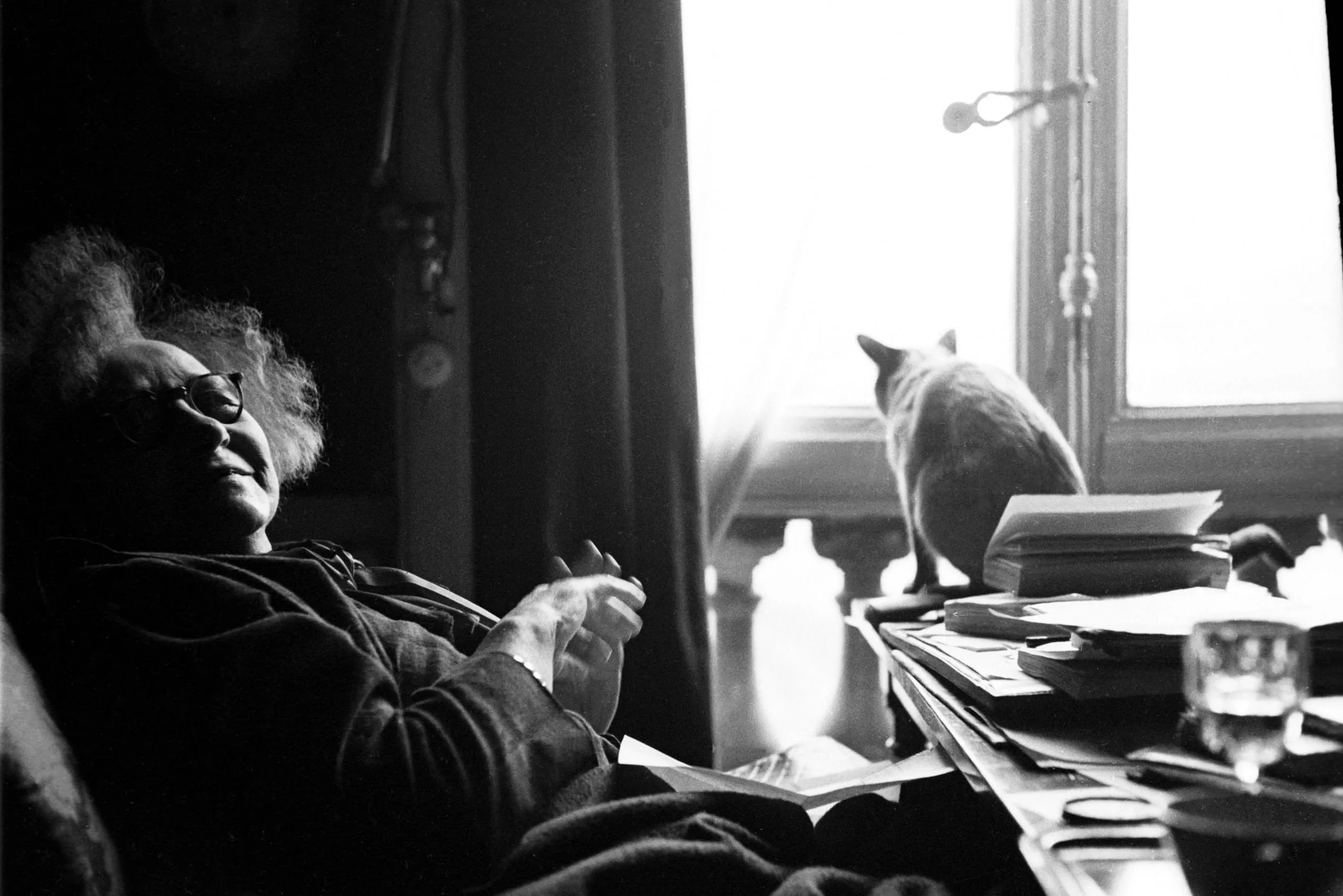 Black and white photograph of a man with curly hair and round glasses reclining and gesturing, with a cat silhouetted against a bright window on a cluttered desk beside him