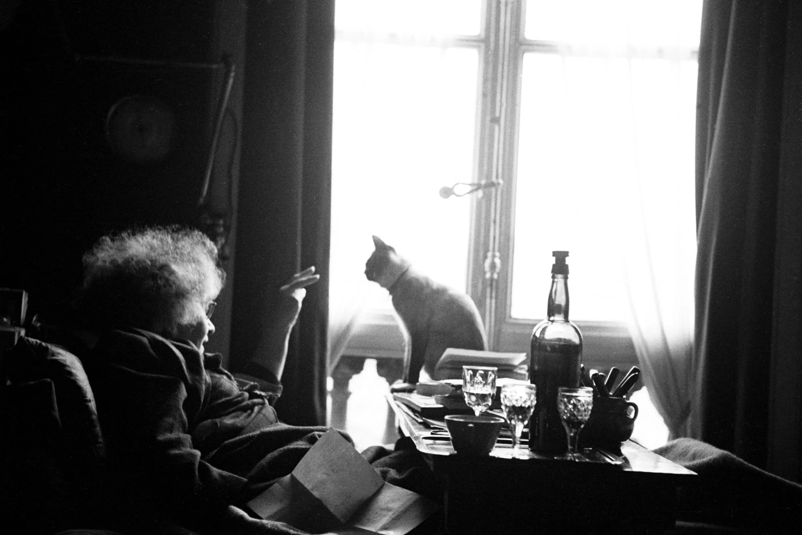 Black and white photograph of a white-haired person gesturing toward a cat silhouetted on a bright windowsill, with bottles and glassware on a table to the right