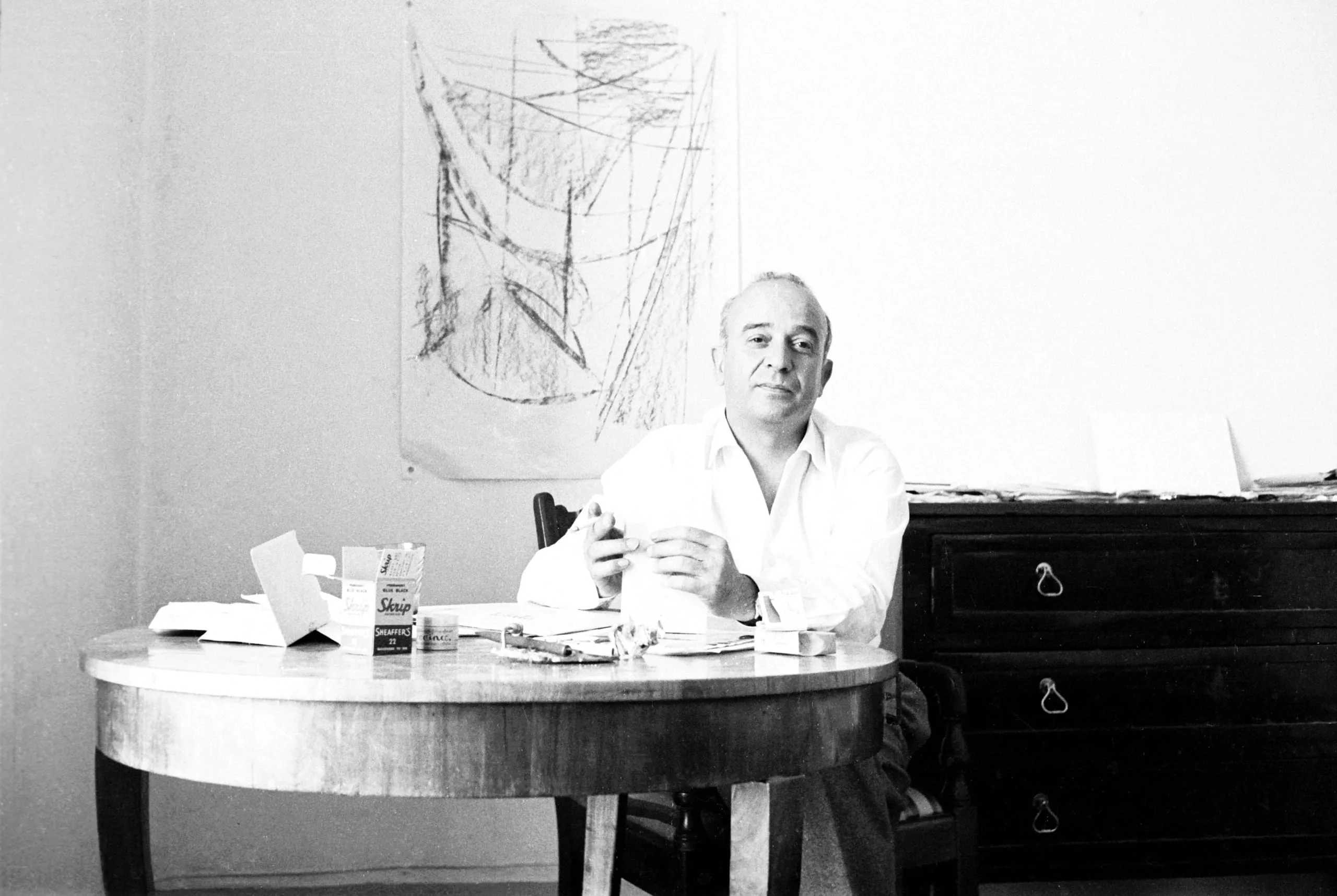 Black and white photograph of a man in a white shirt seated at a round table strewn with papers, a large abstract sketch pinned to the wall behind him