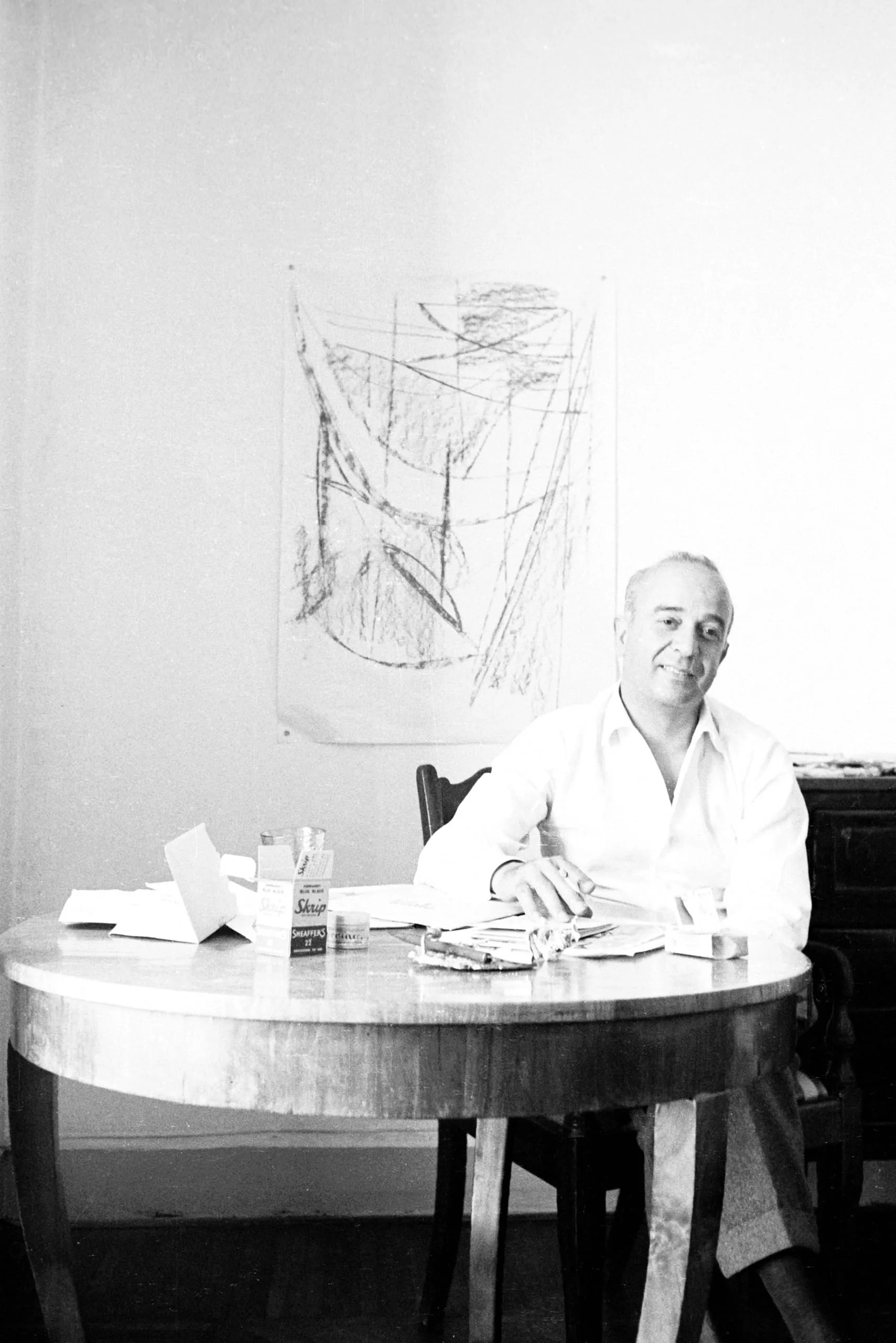 Black and white photograph of a bald man in a white shirt seated at a round table, with a gestural abstract drawing pinned to the wall behind him