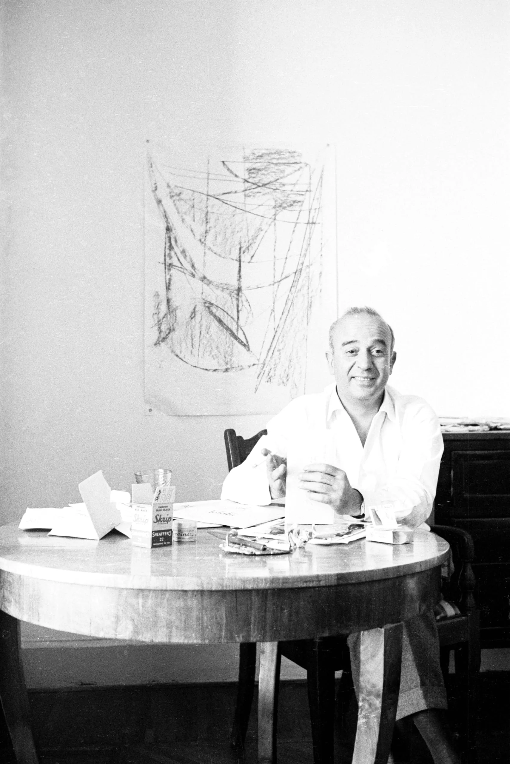 Black and white photograph of a man in a white shirt seated at a round table, an abstract line drawing pinned to the wall behind him