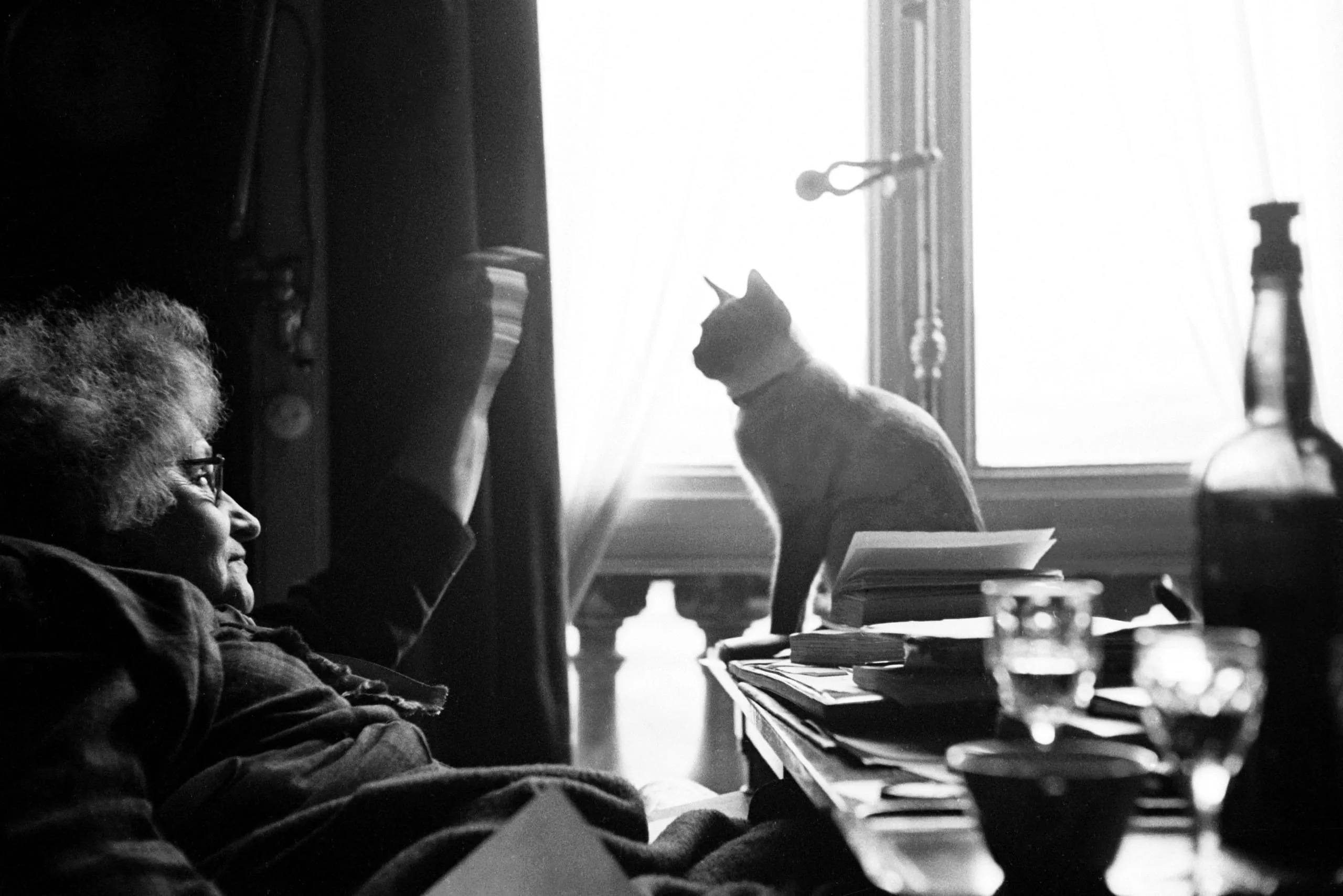 Black and white photograph of a person reclining and reading, with a cat silhouetted against a bright window on a cluttered desk nearby