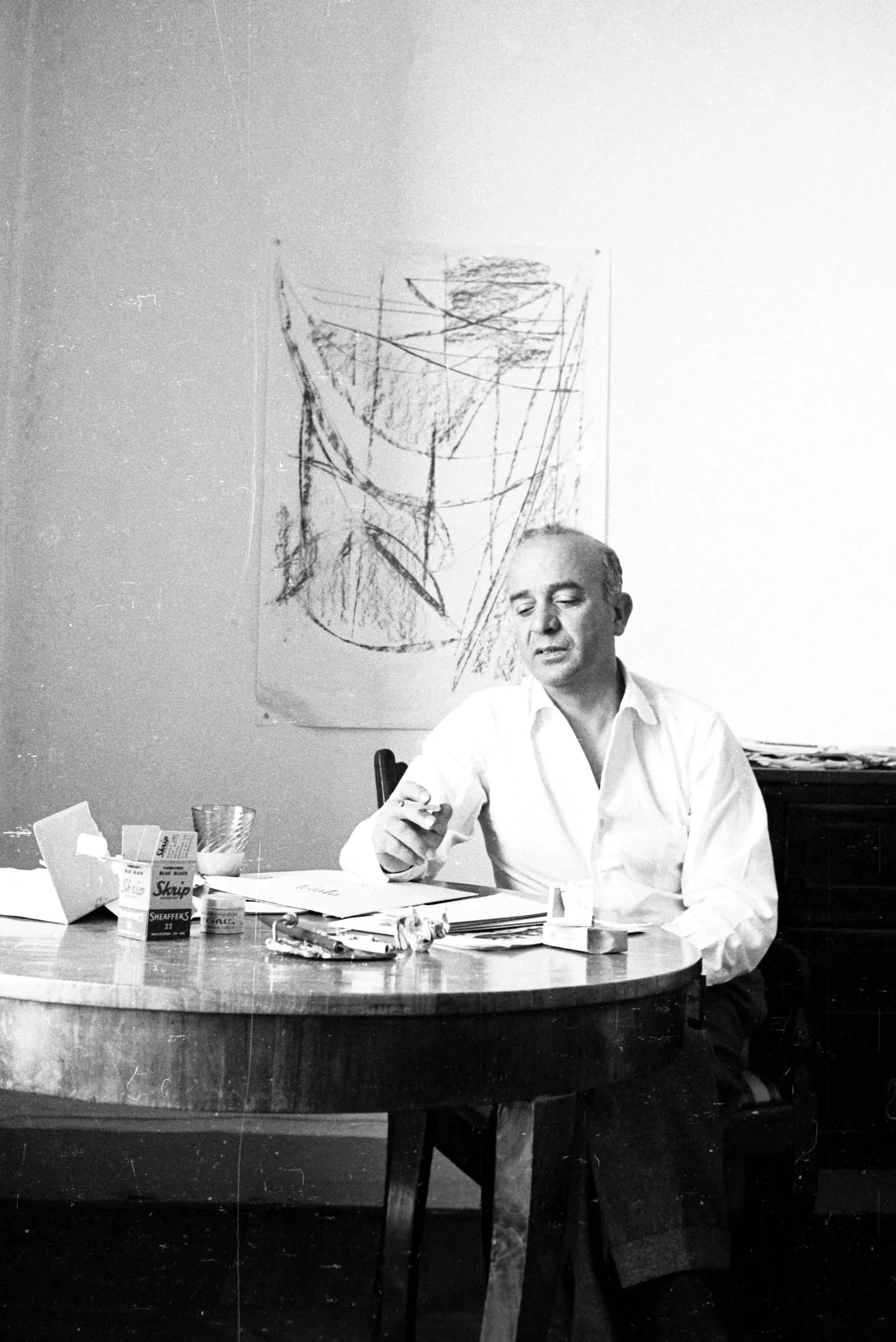 Black and white photograph of a bald man in a white shirt seated at a round table, holding a cigarette, an abstract sketch pinned to the wall behind him