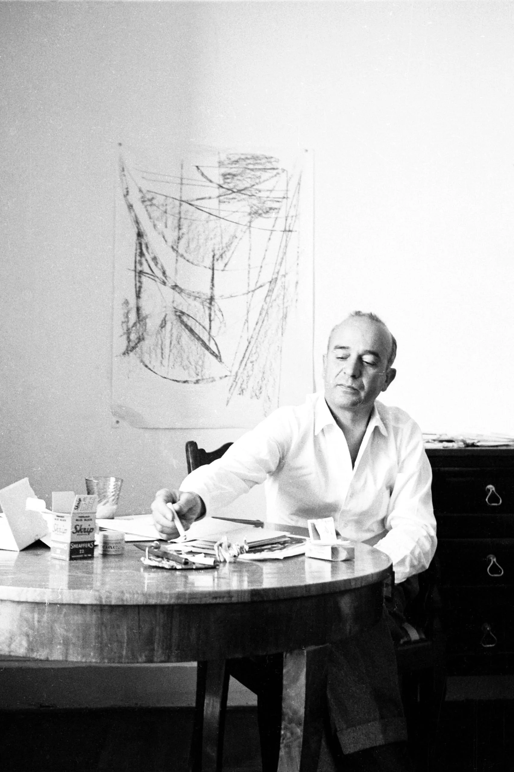Black and white photograph of a pale-skinned man in a white shirt seated at a round wooden table, writing, with an abstract gestural sketch pinned to the wall behind him