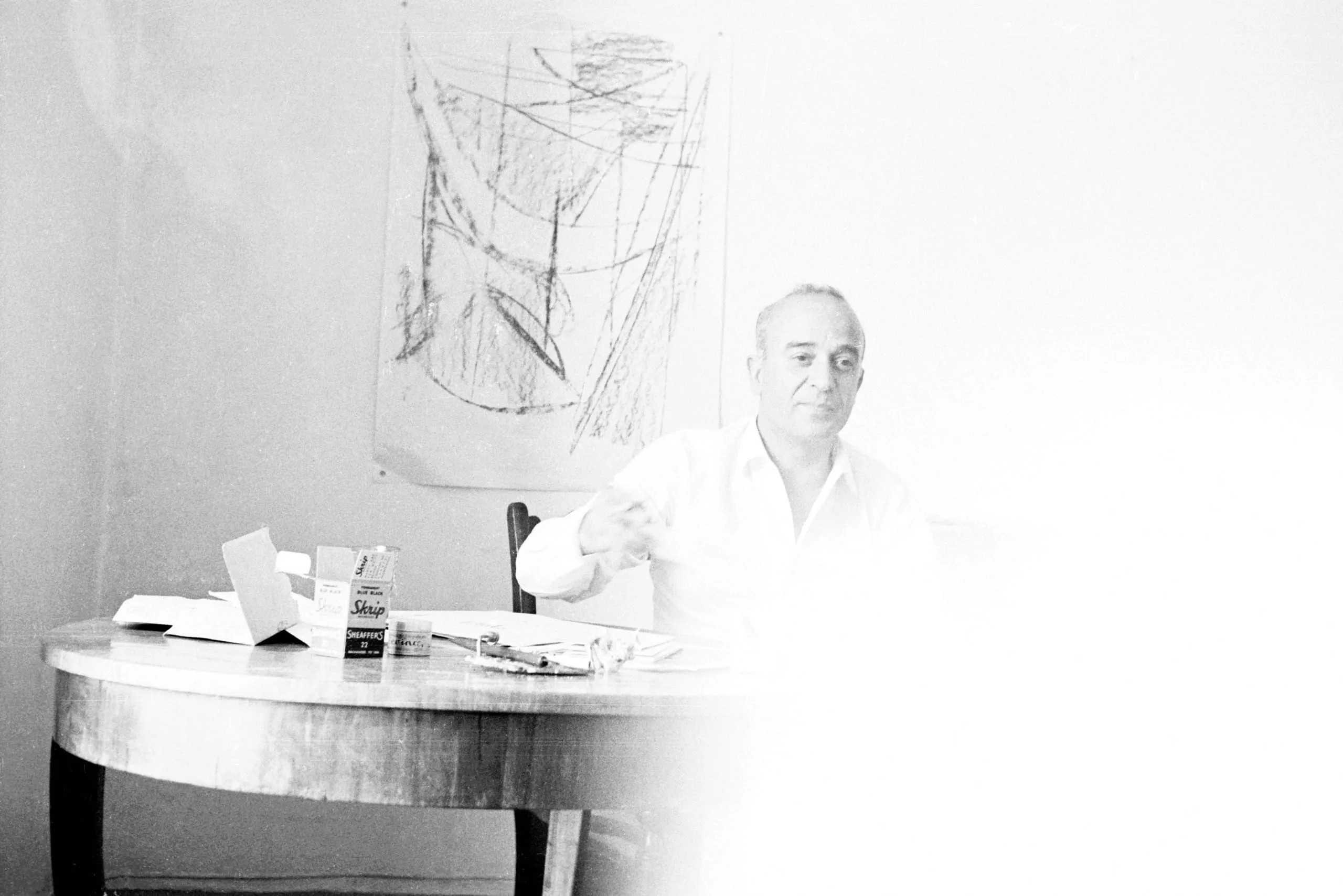 Black and white photograph of a man in a white shirt seated at a round table, mid-gesture, with an abstract charcoal drawing pinned to the wall behind him