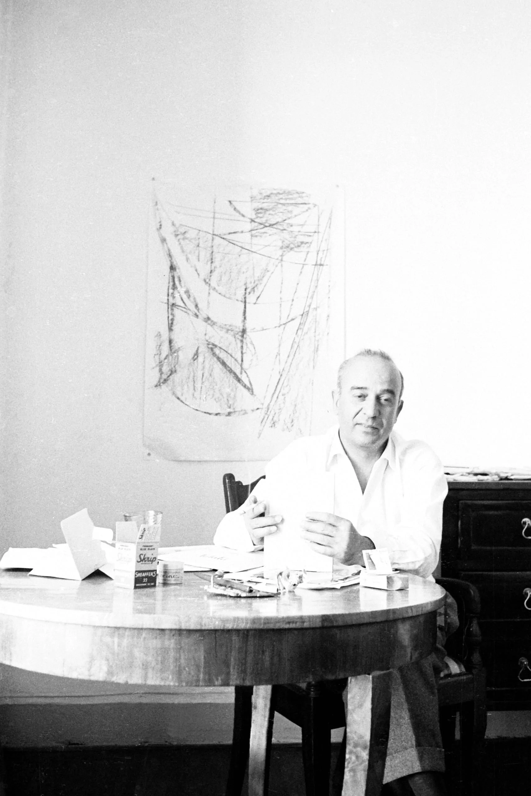 Black and white photograph of a man in a white shirt seated at a cluttered round table, a large abstract crayon drawing pinned to the wall behind him