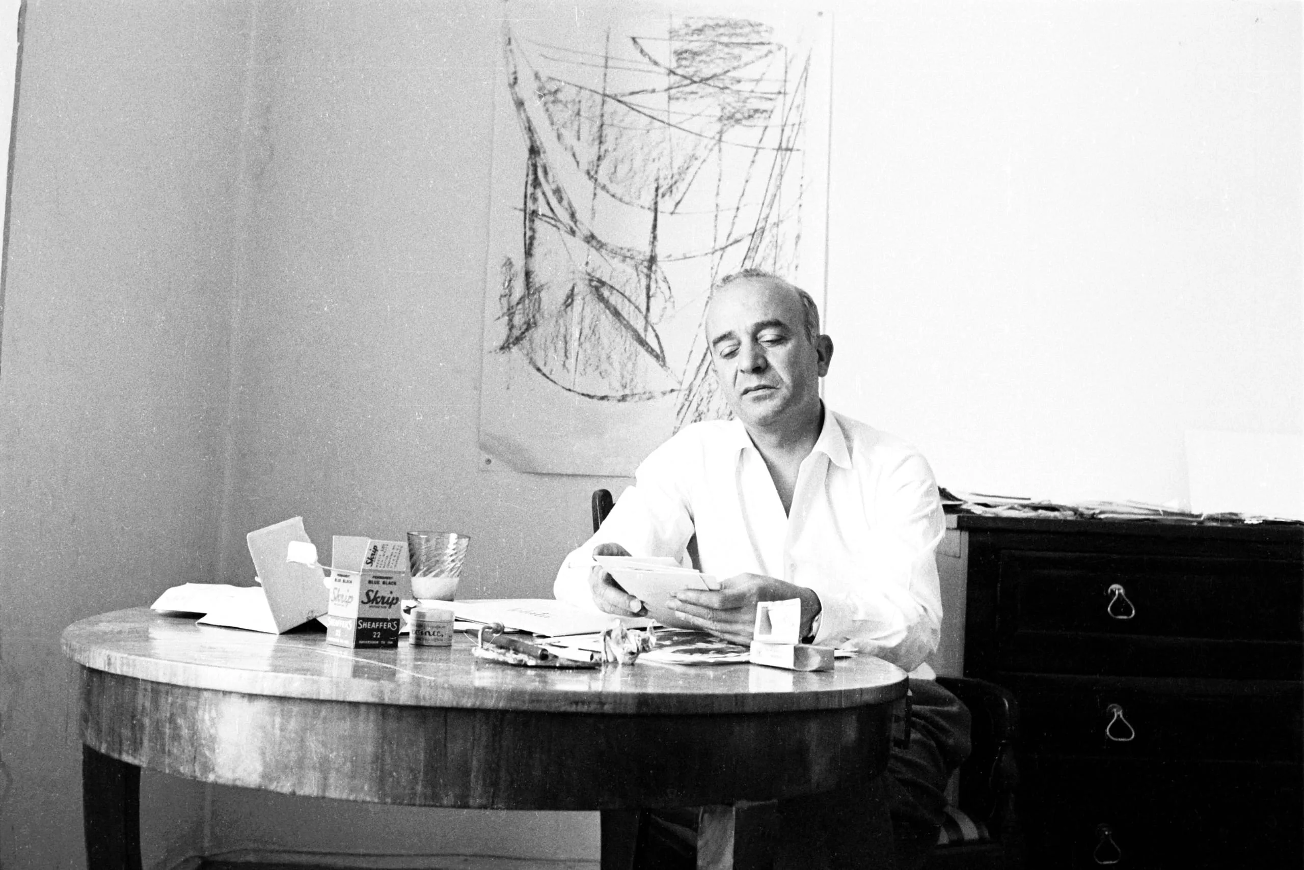Black and white photograph of a bald white man in a white shirt seated at a cluttered round table, reading a small paper, with an abstract drawing pinned to the wall behind him