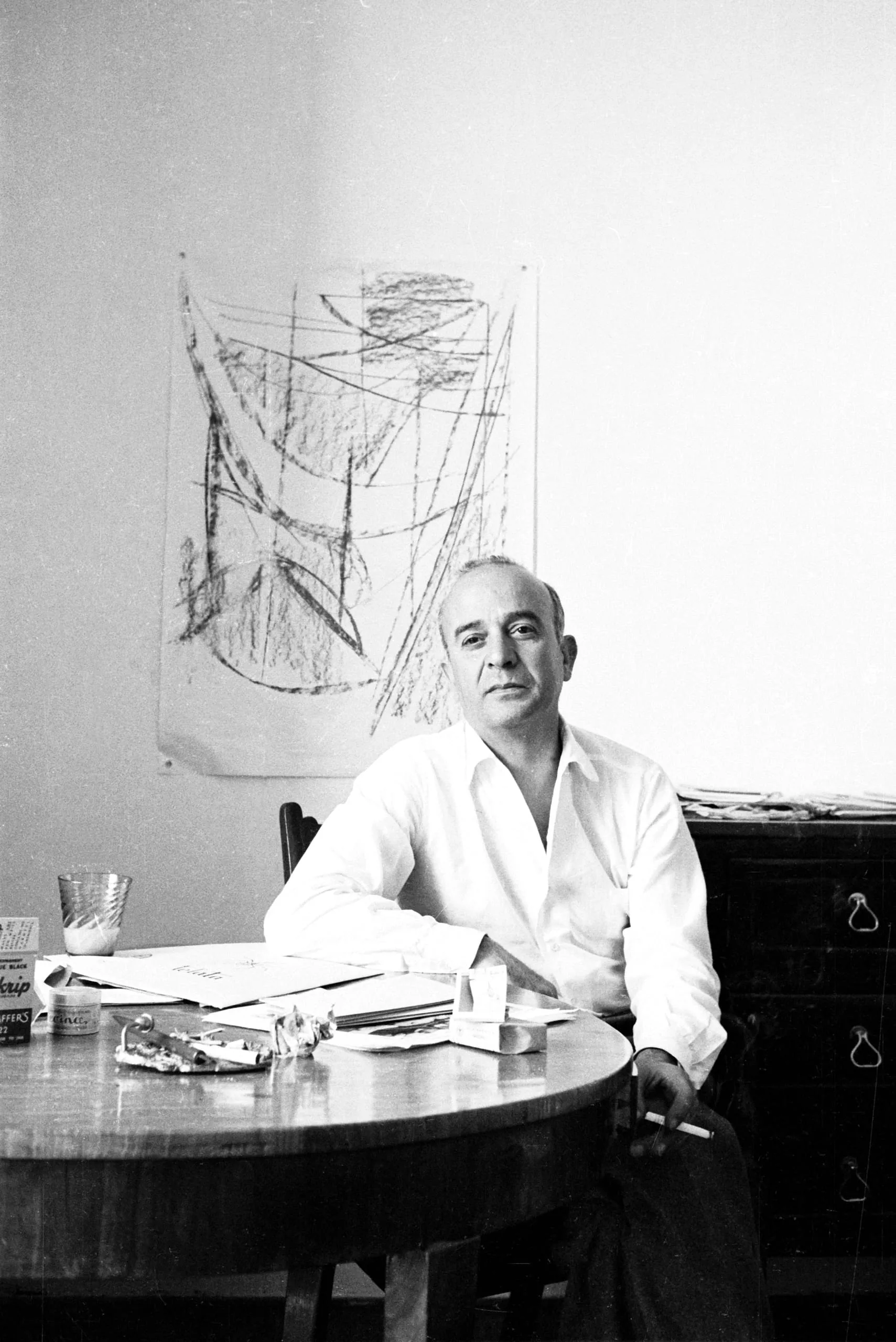 Black and white photograph of a man in a white open-collar shirt seated at a round table, an abstract drawing pinned to the wall behind him