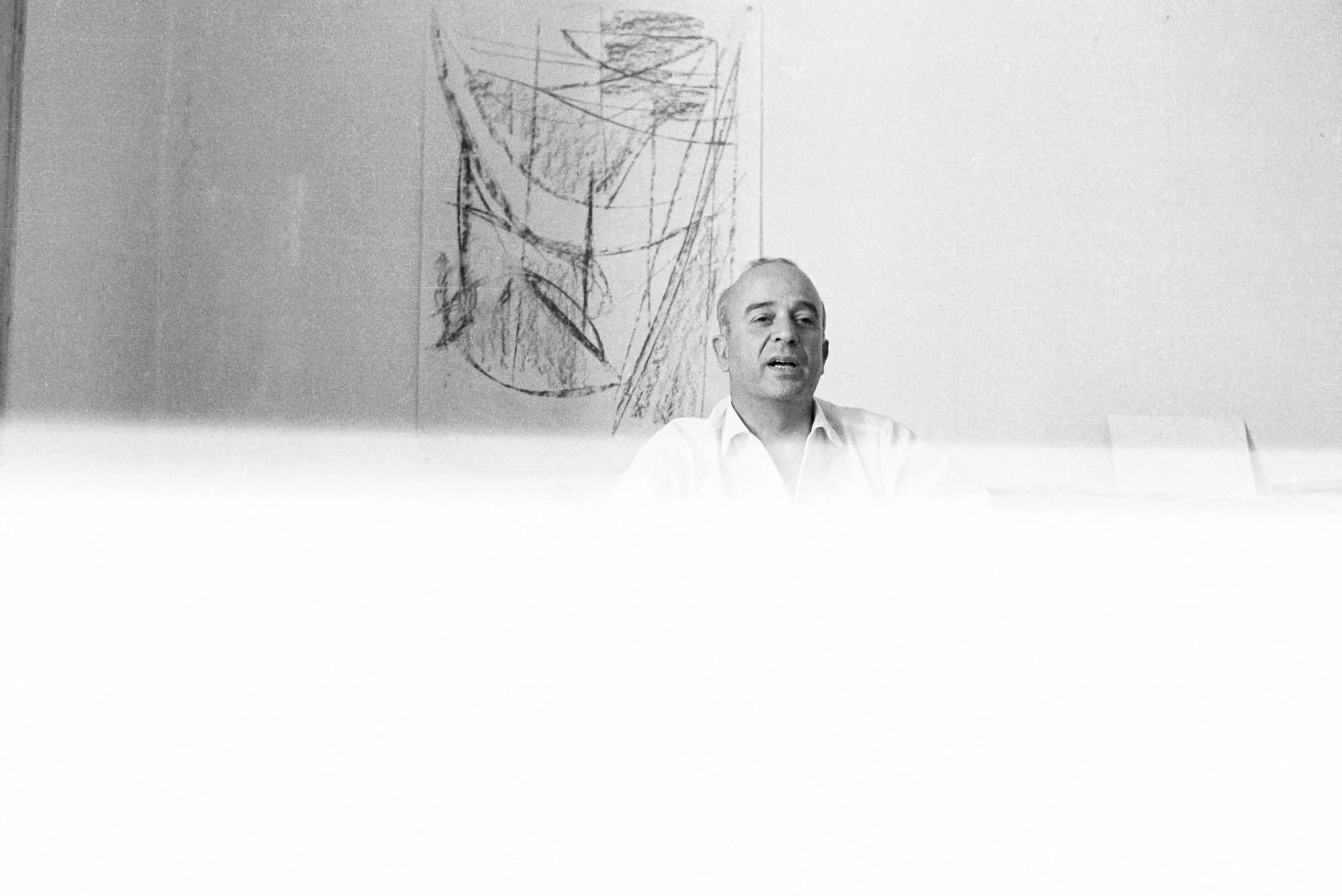 Black and white photograph of a man in a white shirt, chest-up, speaking in front of a wall hung with a large gestural charcoal sketch