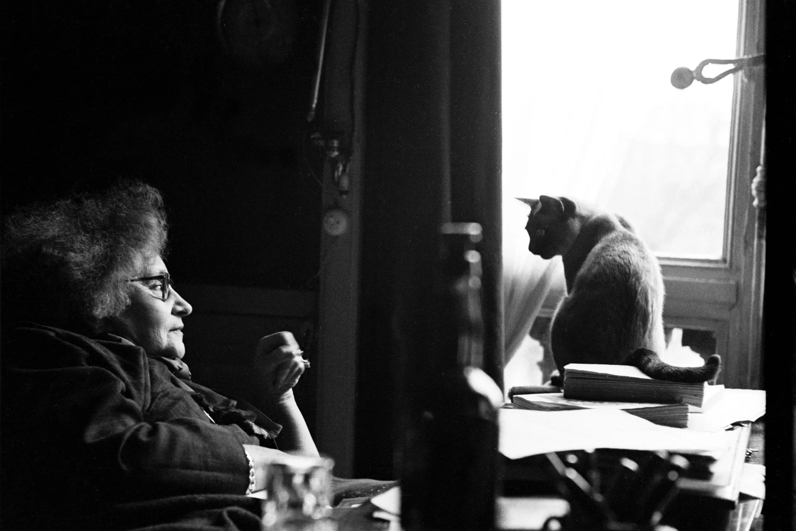 Black and white photograph of a woman in profile seated at left, looking toward a bright window where a dark cat sits on a stack of books, high-contrast interior lighting
